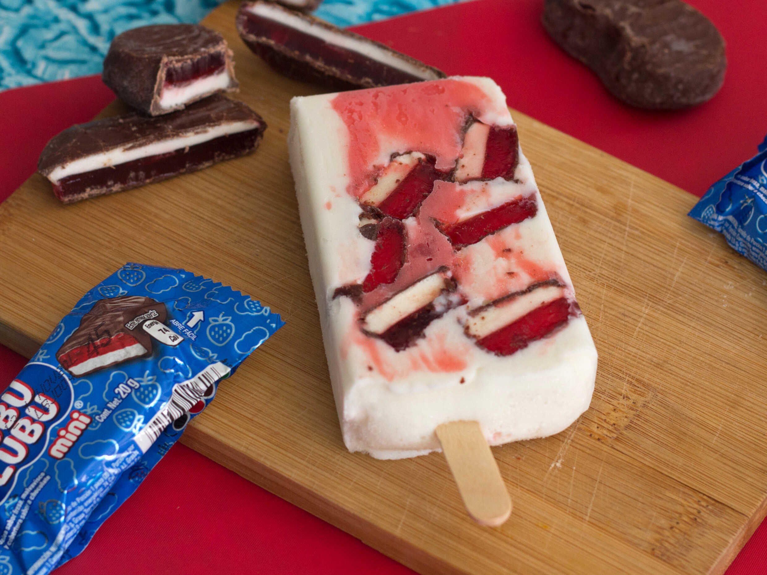 Paleta cremosa de 110 ML s 4.8 gr carbs x porción; pastelito estilo gansito (harina de almendra, cocoa 100%, huevo) leche de almendras, crema, crema para batir, mermelada de fresa natural, goma guar y endulzado con monk fruit.