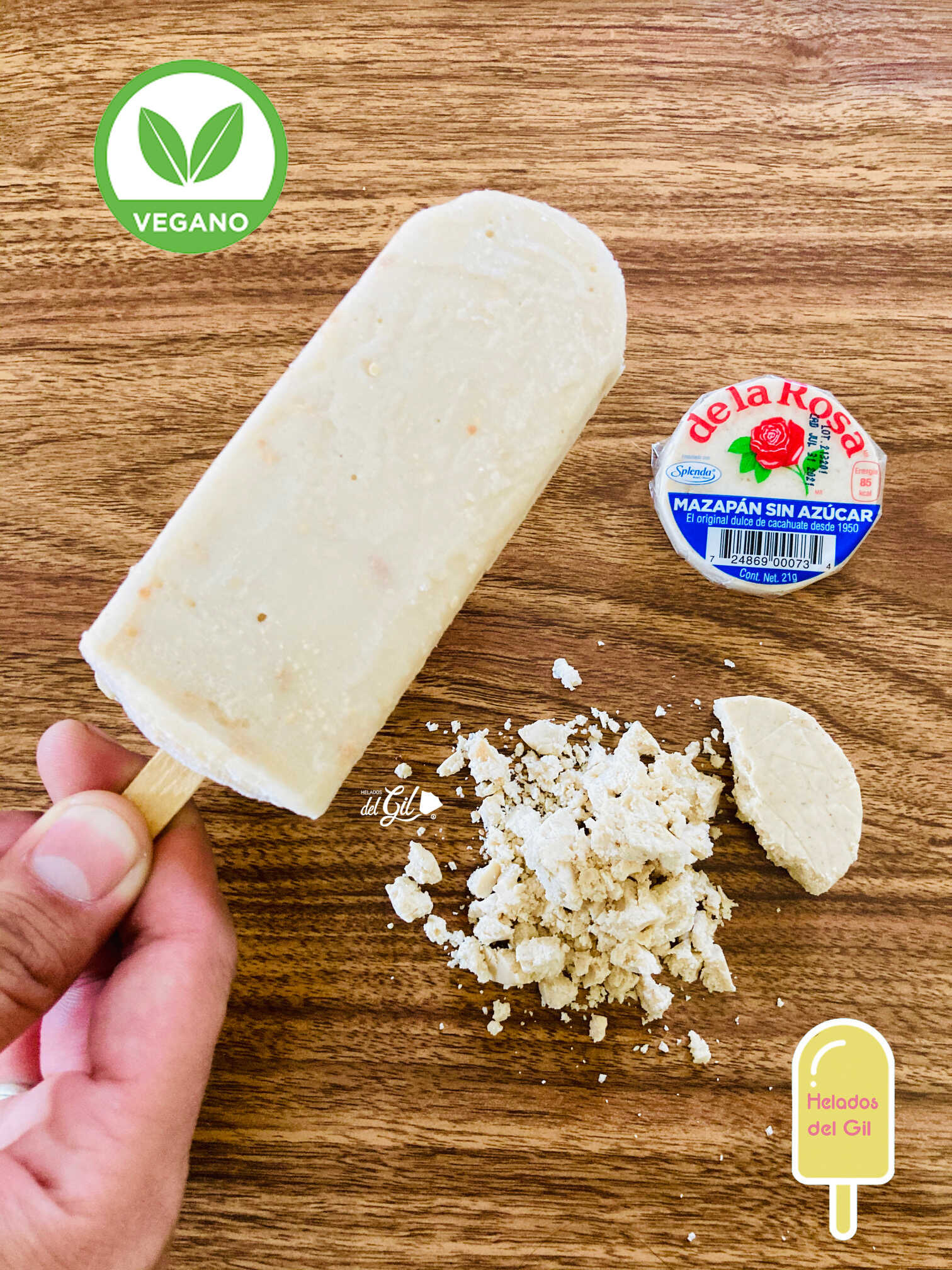 Paleta de 110 ml 5.32 gr carbs x porción: mazapán endulzado con Splenda, cacahuate, goma guar, leche de almendras, endulzado con monk fruit.