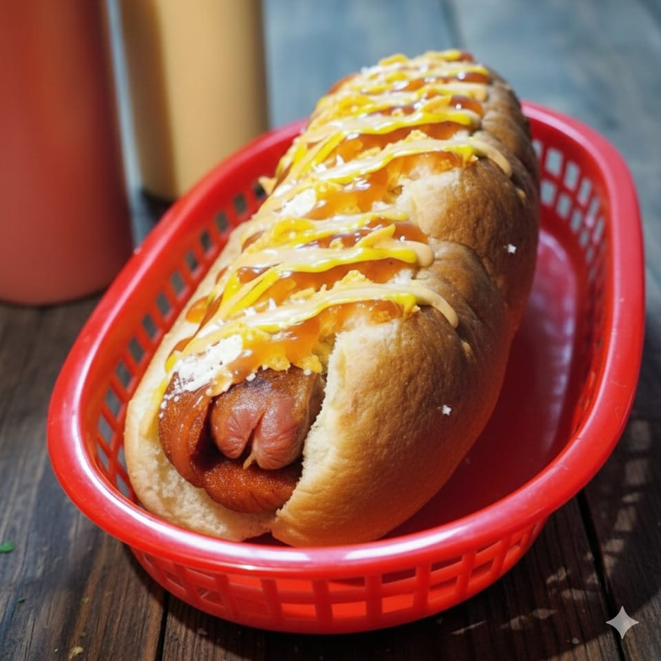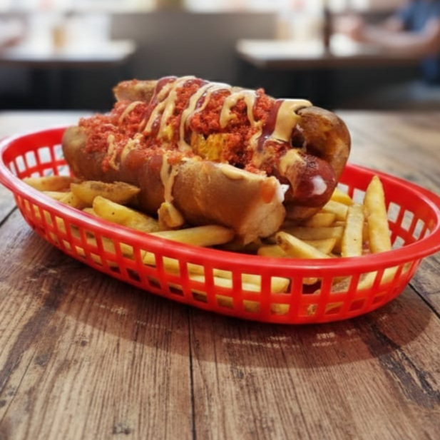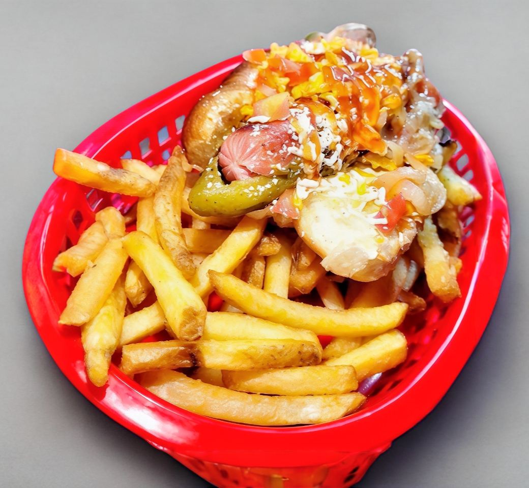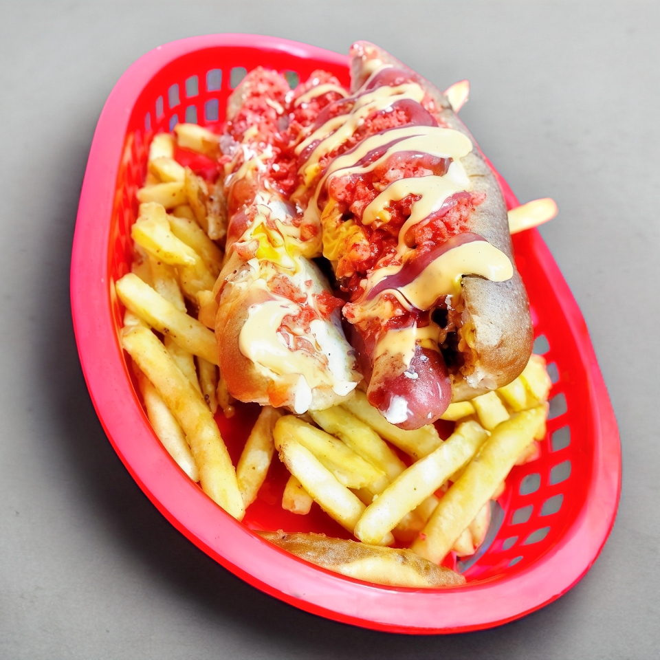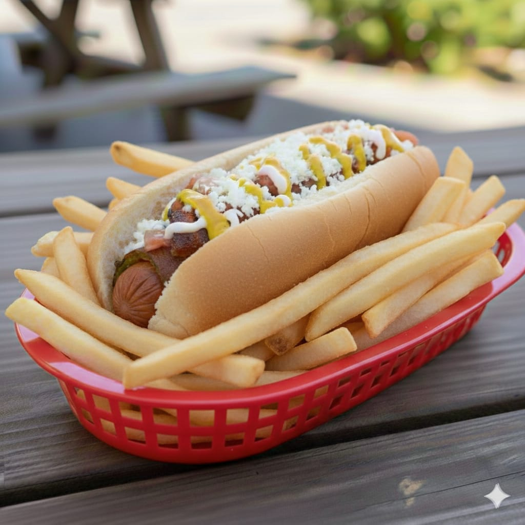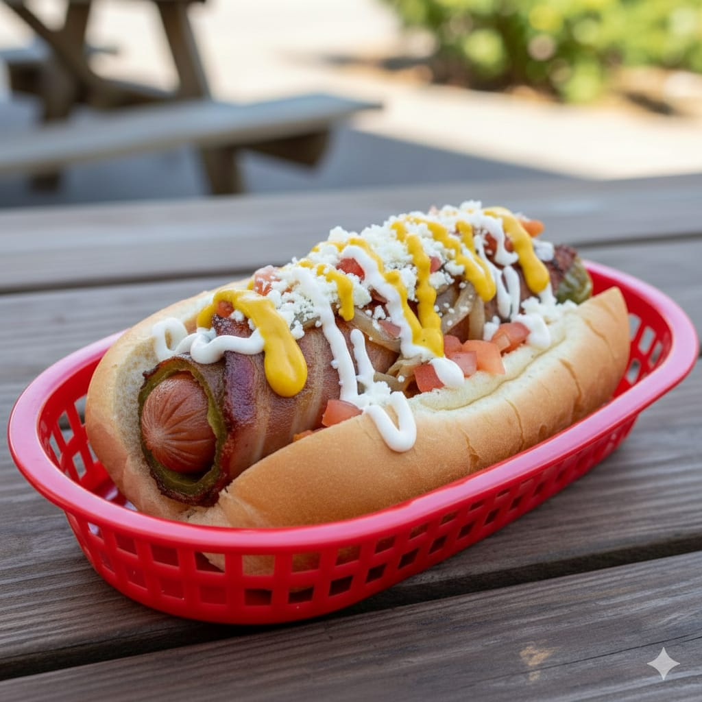 Pan casero con una salchicha dentro de otra salchicha roja, envueltas en tocino con queso philadelphia, mayonesa, cátsup, tomate y cebolla asada. No incluye papas.
