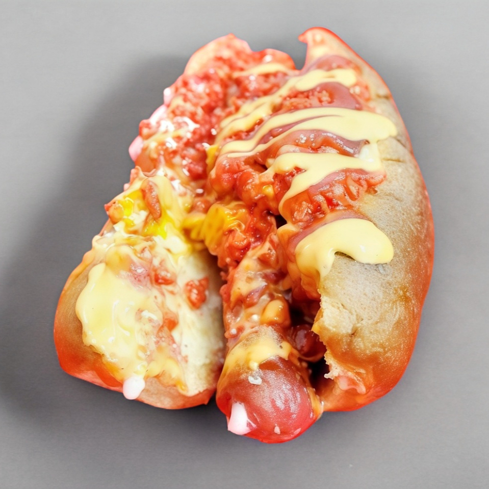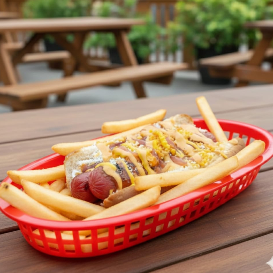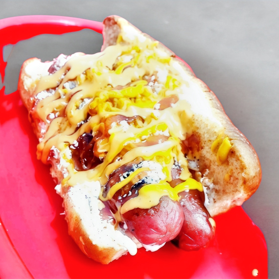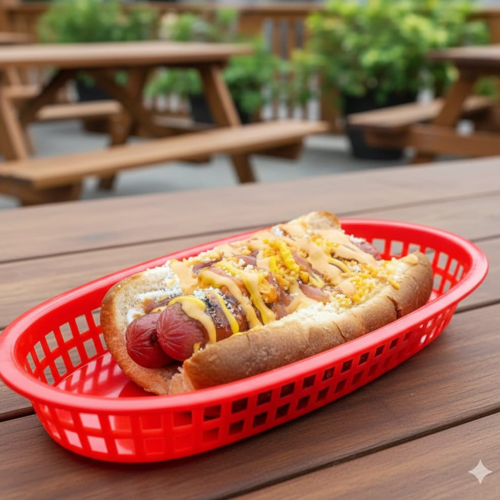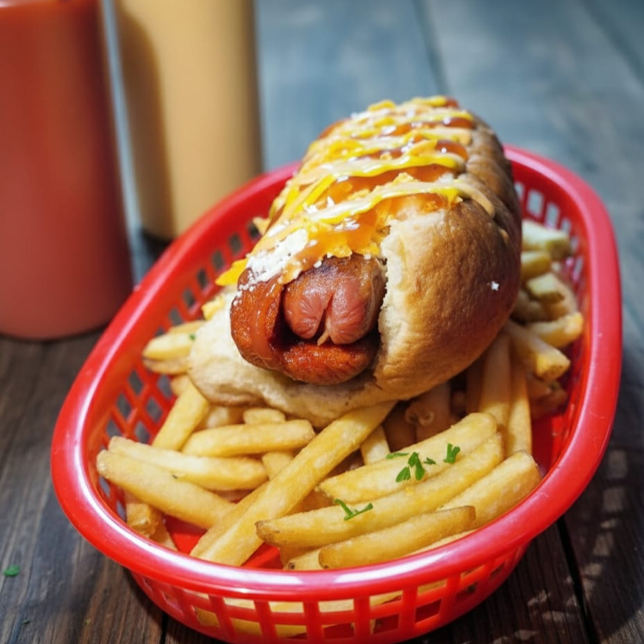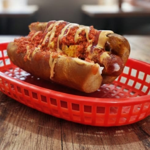 Pan casero con una salchicha dentro de otra salchicha roja, envueltas en tocino con queso philadelphia, mayonesa, cátsup, tomate y cebolla asada. No incluye papas.