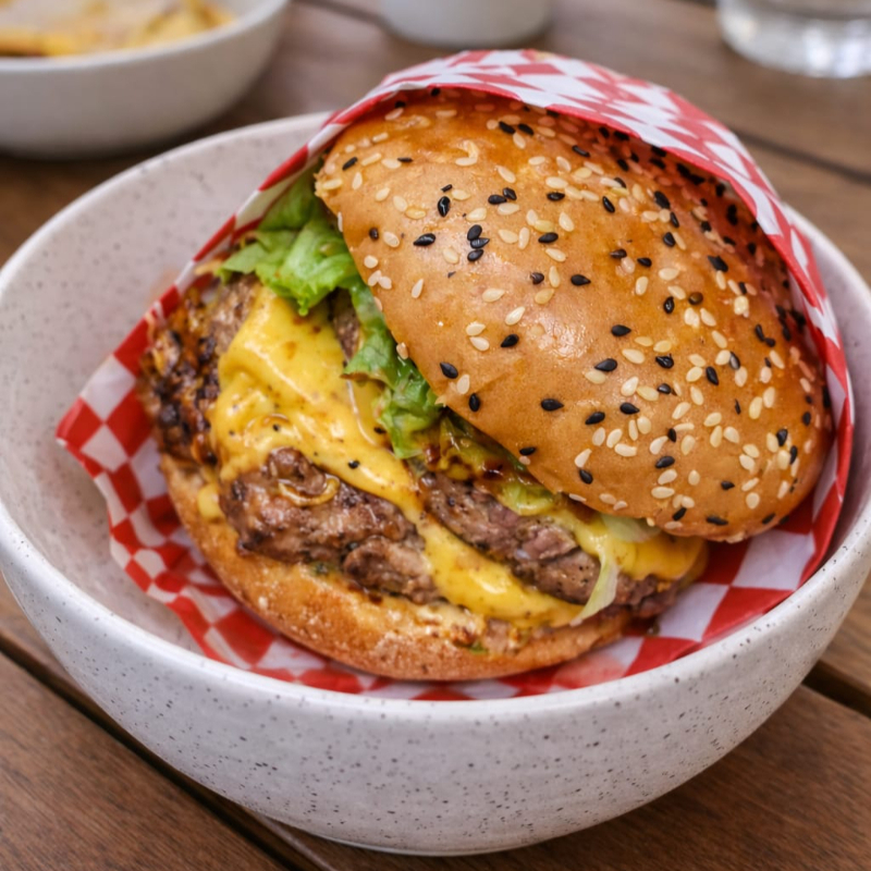 Carne 100% res de 150gr, queso americano, mayonesa, catsup, mostaza, cebolla cruda, tomate y lechuga.
