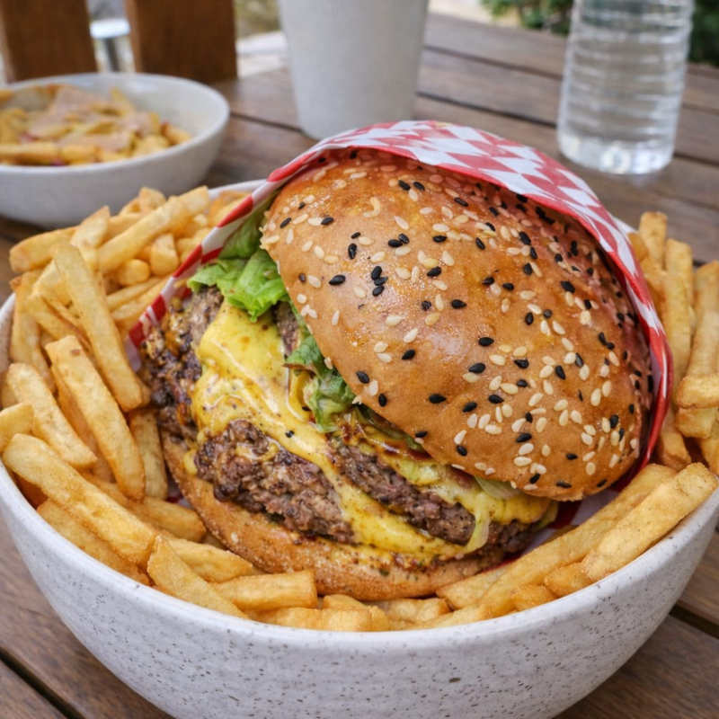 Carne 100% res de 150gr, queso americano, mayonesa, catsup, mostaza, cebolla cruda, tomate y lechuga. INCLUYE PORCION DE PAPAS.