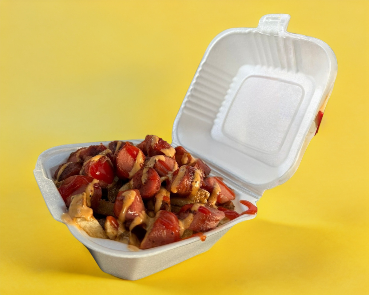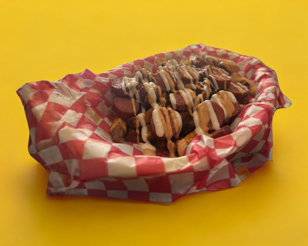 Salchichas en rodajas con papas fritas, bañadas en aderezos y salsas al gusto.