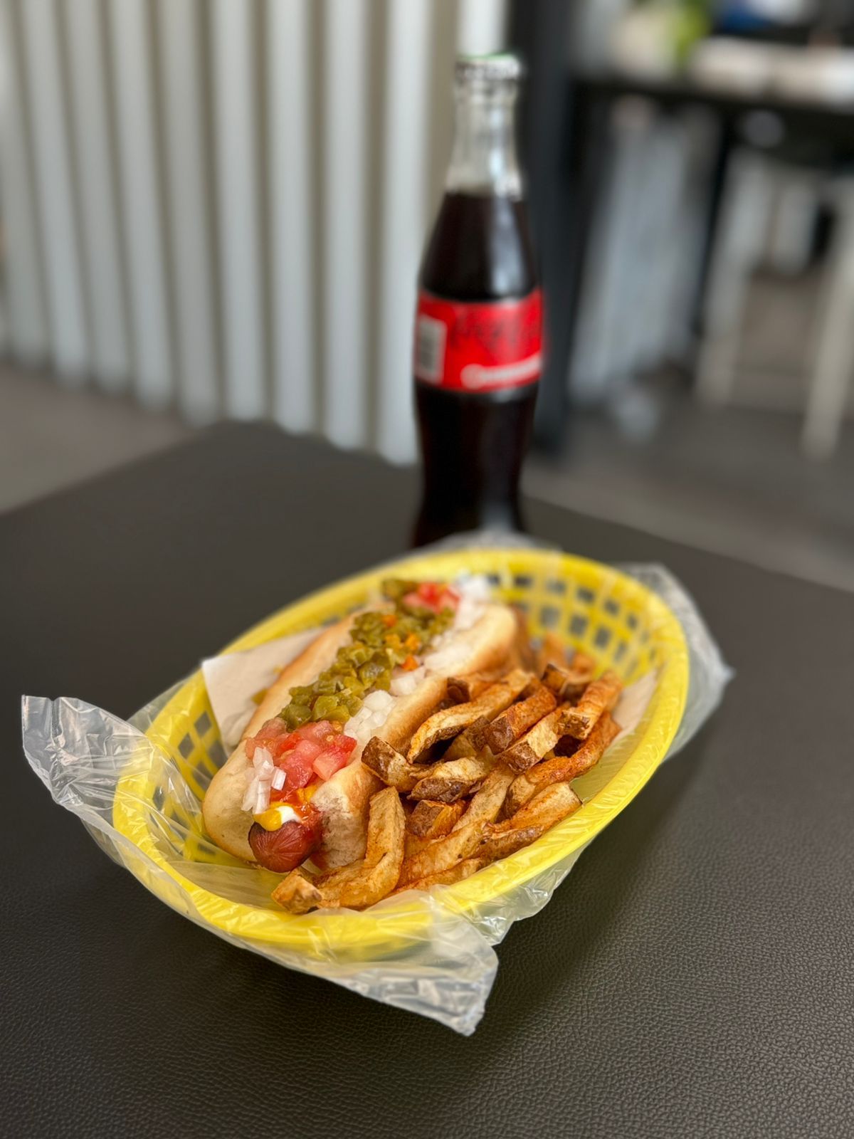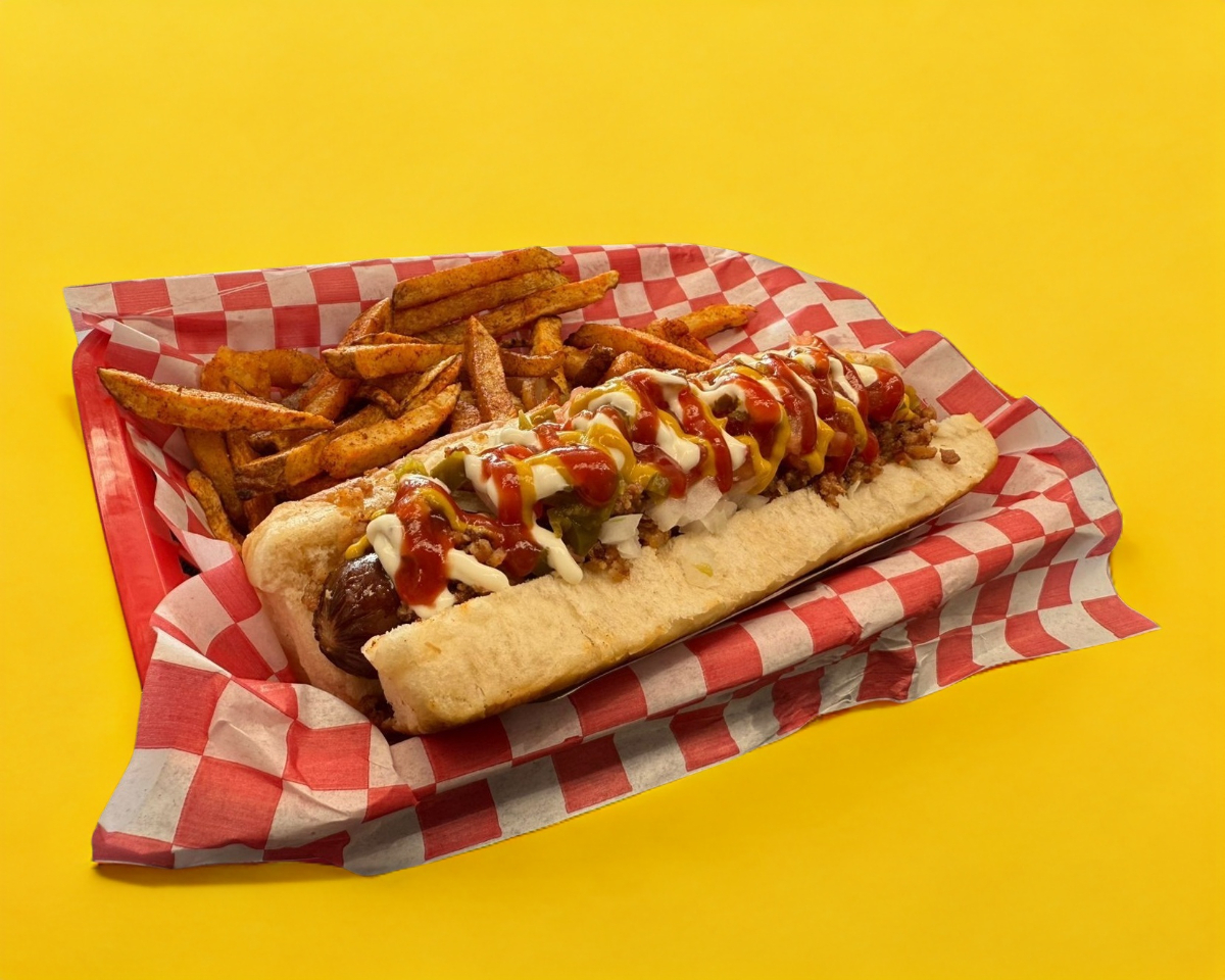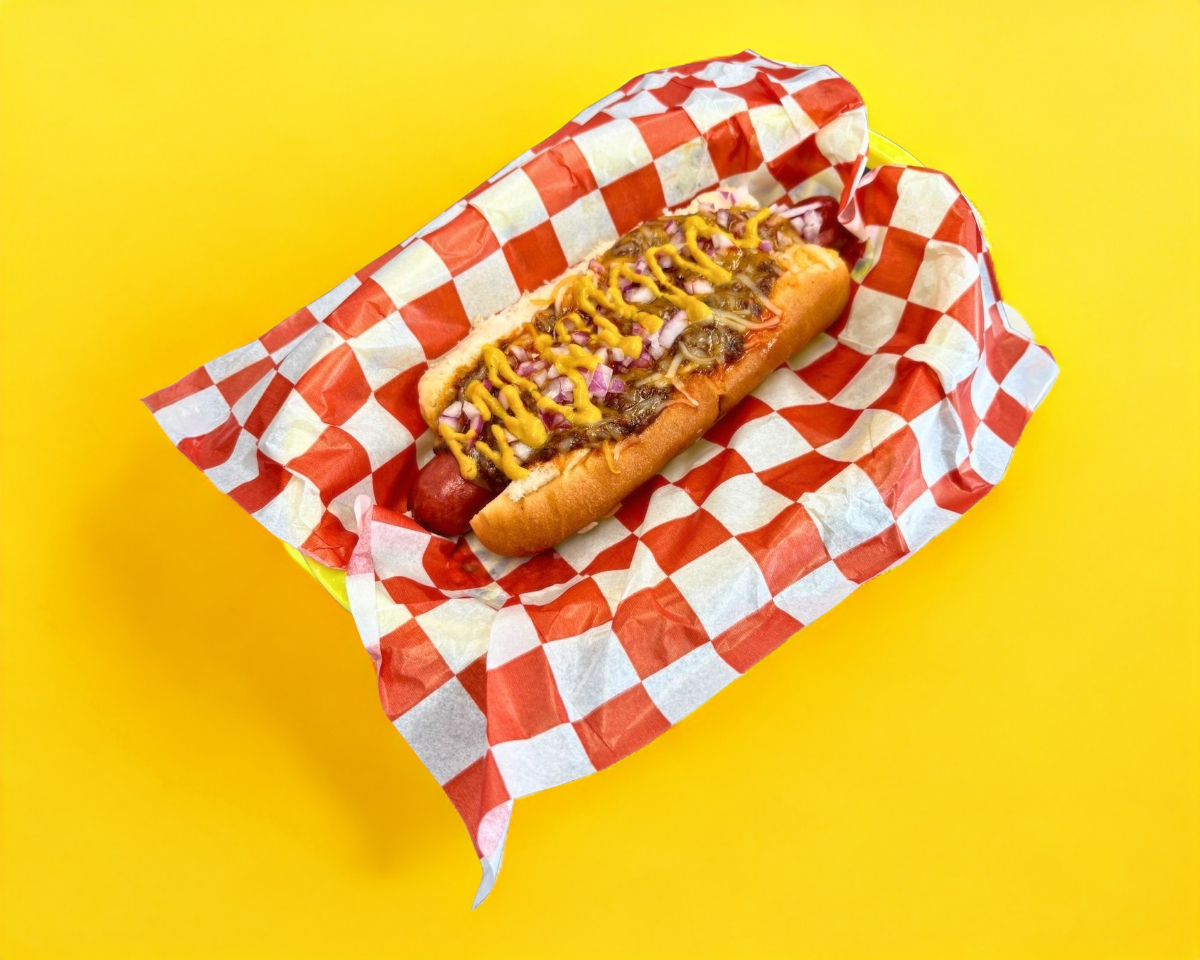 Hot dog con salchicha de res de 1/4 lb, cubierto con chili beans, queso, cebolla y jalapeño.