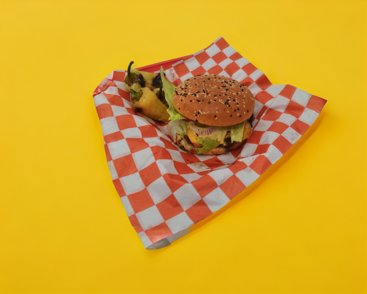 Hamburguesa tradicional con carne de res, lechuga, jitomate y aderezos, acompañada de papas fritas.