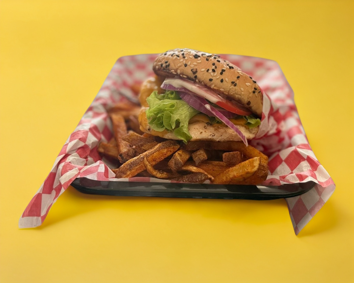 Hamburguesa de pechuga de pollo a la plancha con lechuga, jitomate y aderezo, con papas fritas.