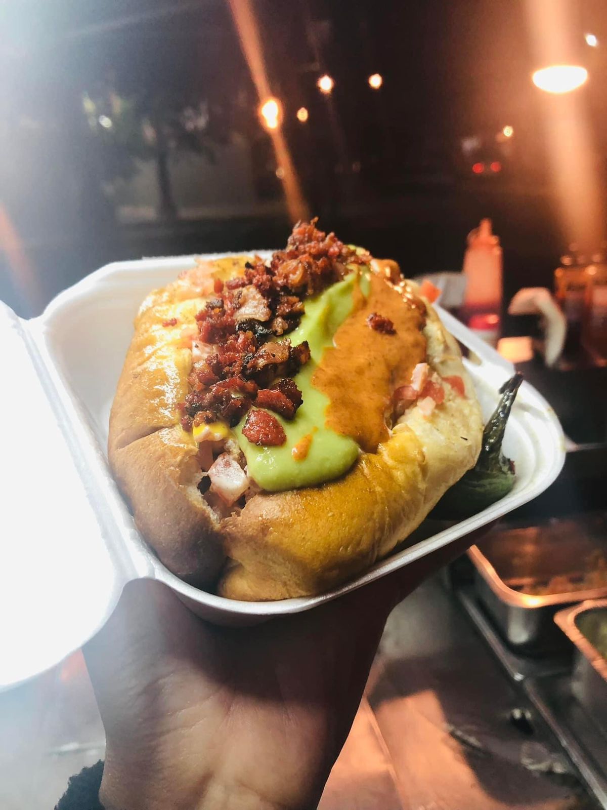 Hotdog Jumbo Salchicha con queso monterrey jack envuelto jamon y tocino