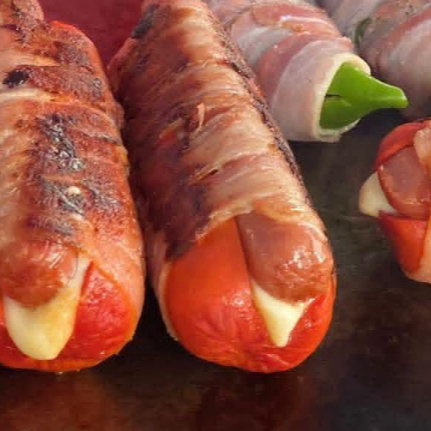 Hot dog de chile California relleno de queso, salchicha y enrollado en crujiente tocino.