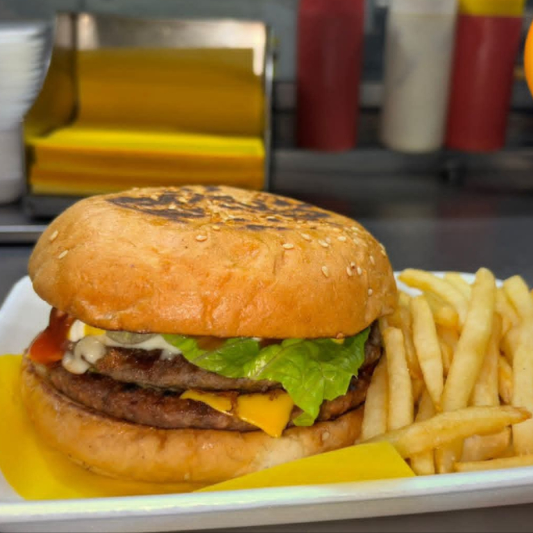Doble porción de carne de res jugosa con queso y vegetales, acompañada de papas fritas.
