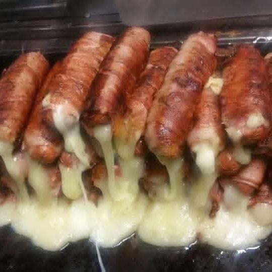 Combinación de salchicha de asar con salchicha Rosarito, queso y tocino.