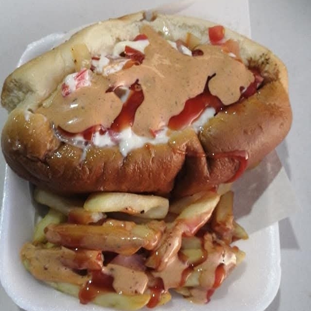 Innovador hot dog de camarón, acompañado con queso, jamón y tocino.