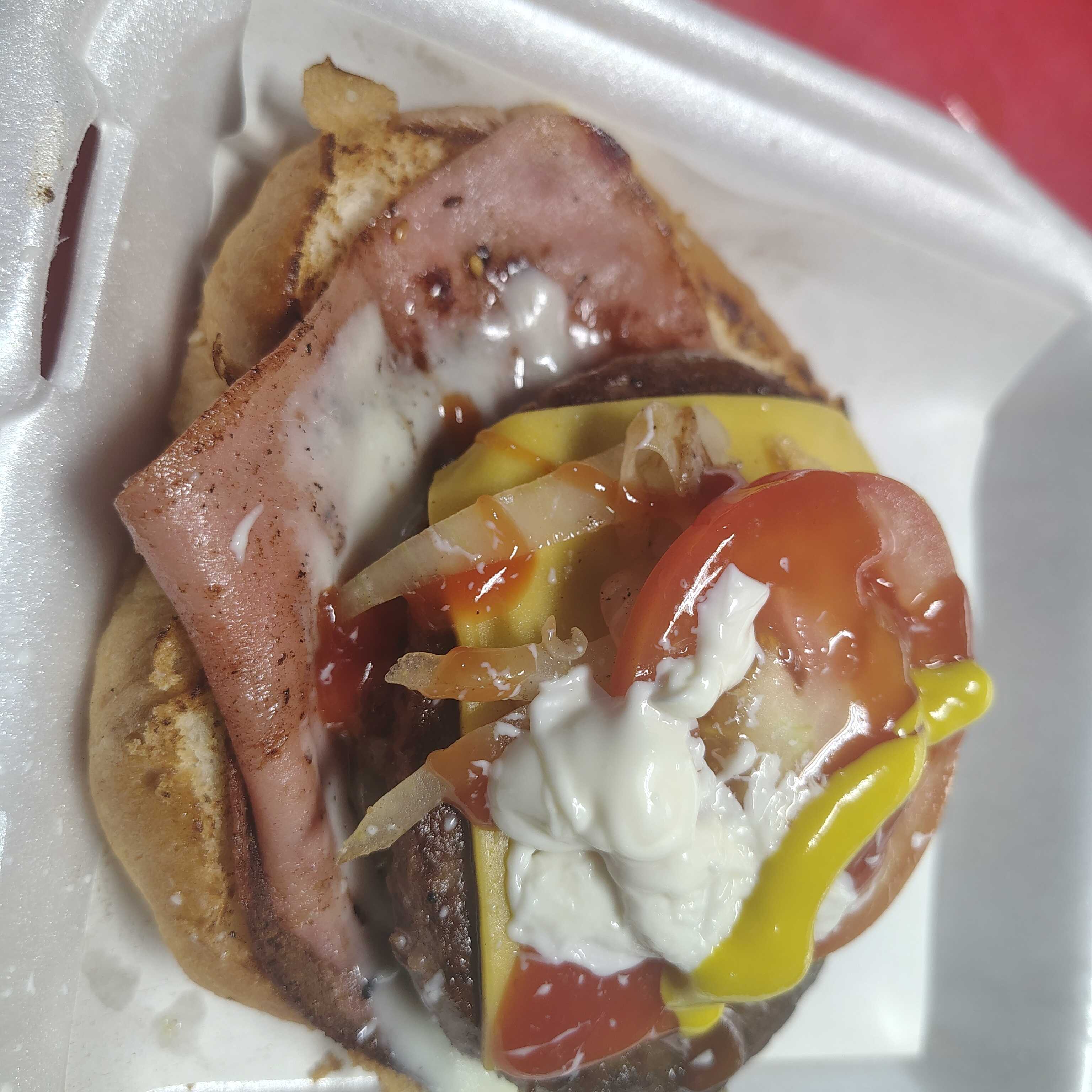 Combinación dulce y salada con carne de res, jamón y piña asada, acompañada de papas fritas.