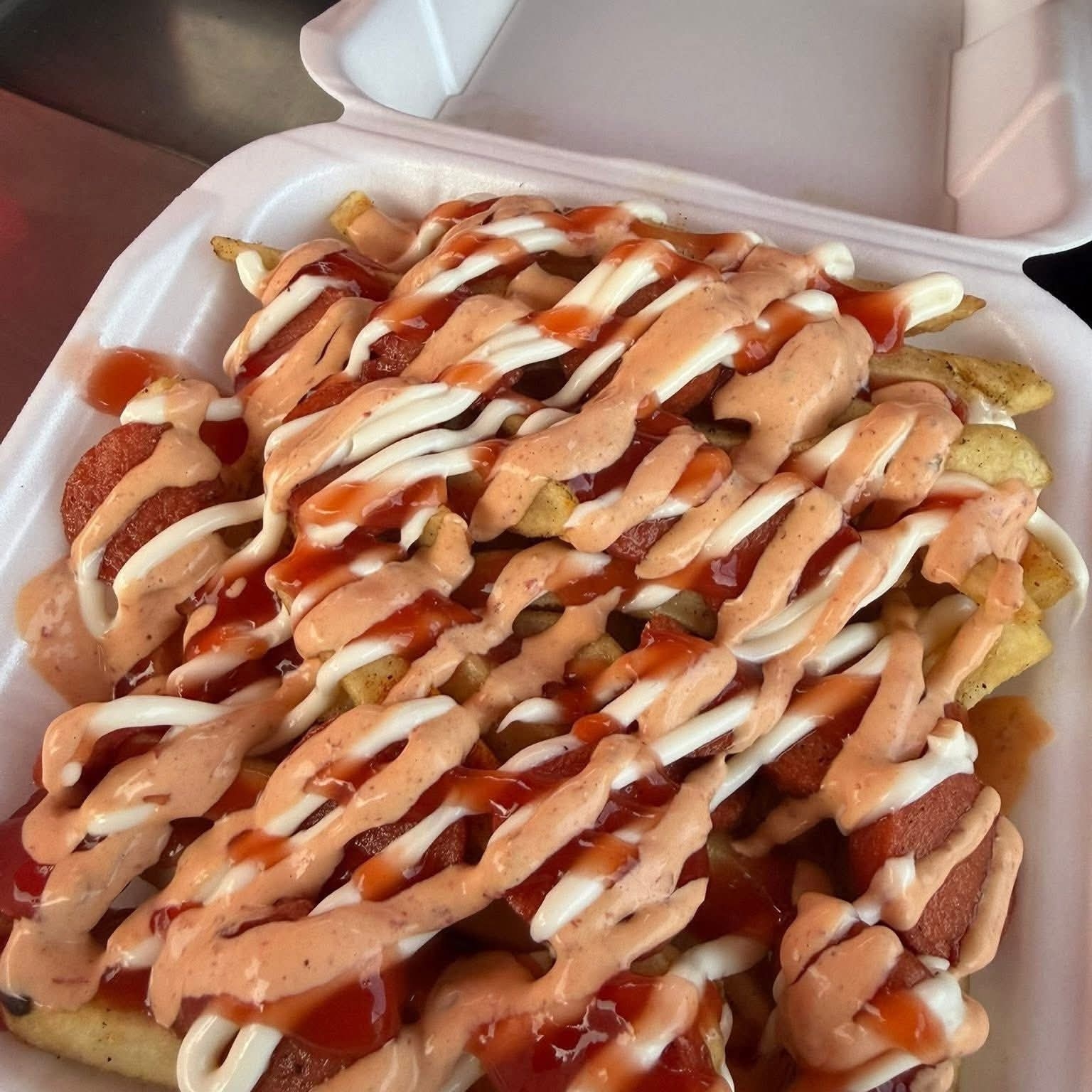Cama de papas fritas crujientes con trozos de salchicha frita y aderezos al gusto.