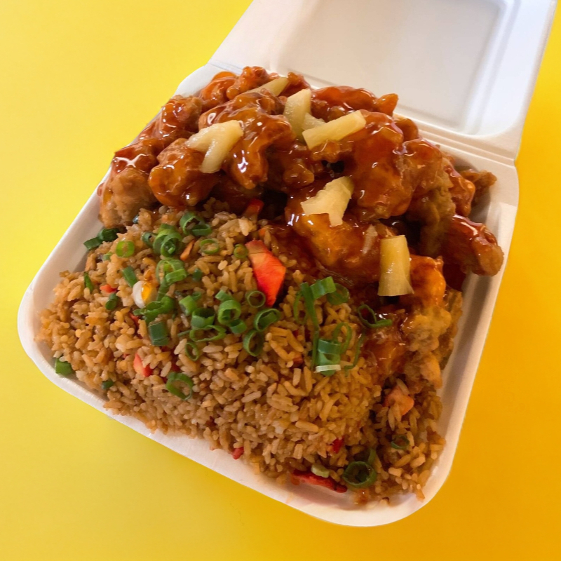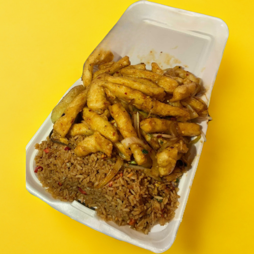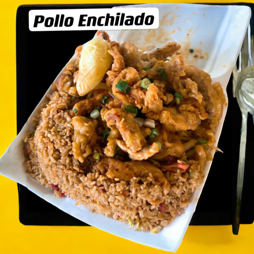 Arroz frito, tilita de pollo empanizado enchilado con chile de árbol y cebolla, chile asado.