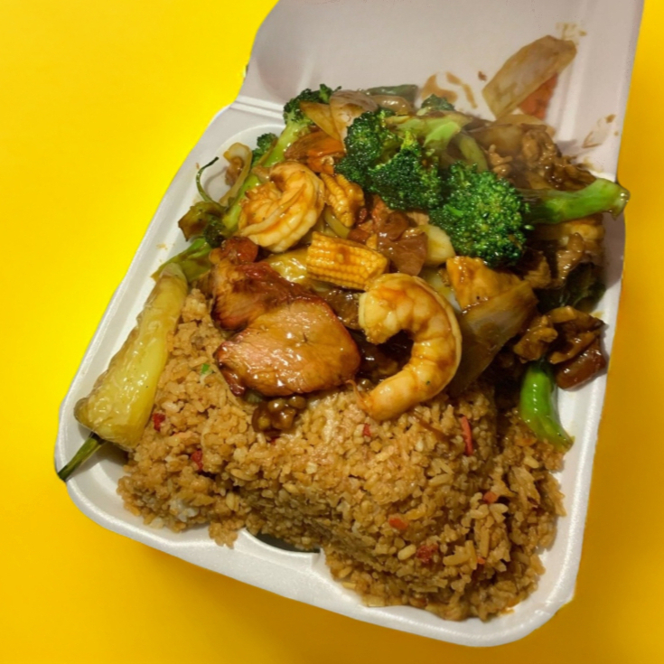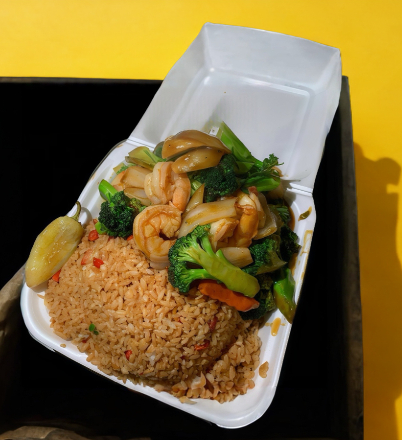 Arroz frito, carne de res revuelto con la salsa especiales de la casa con brócoli, zanahoria, cebolla, chile asado.