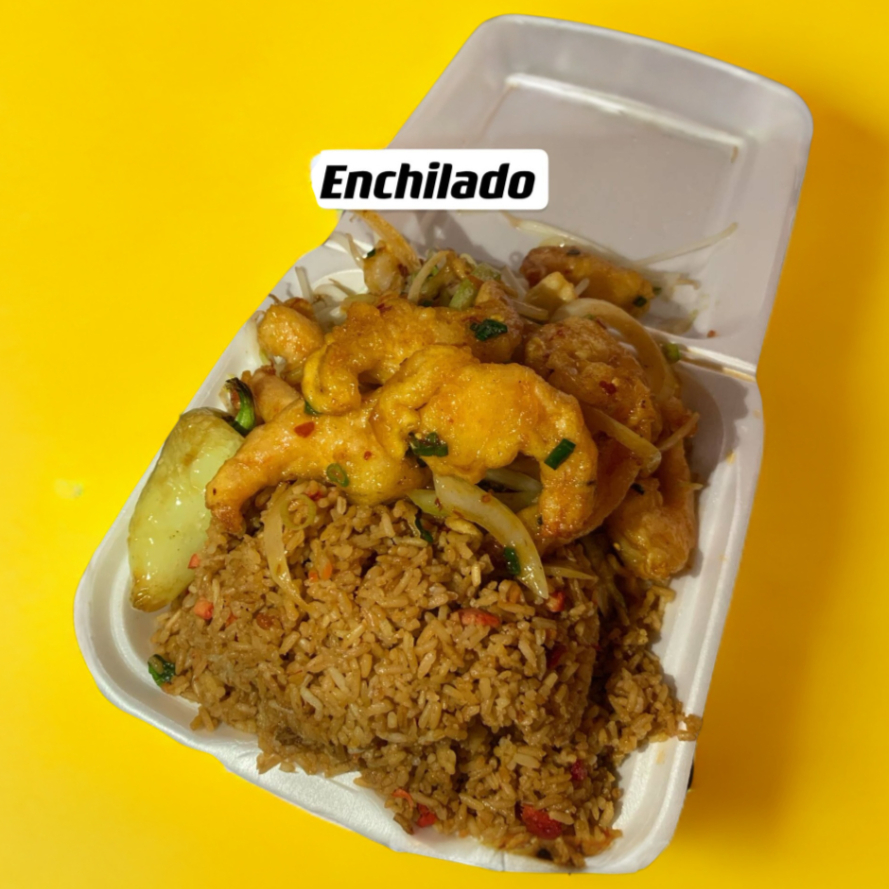 Arroz frito, camarón enchilado, chile asado.