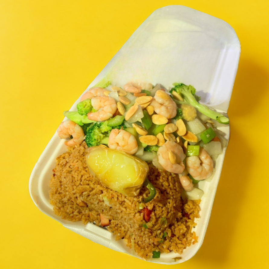 Arroz frito, combinación con camarón, chorizo chino, pollo, carnita asada, chile asado.