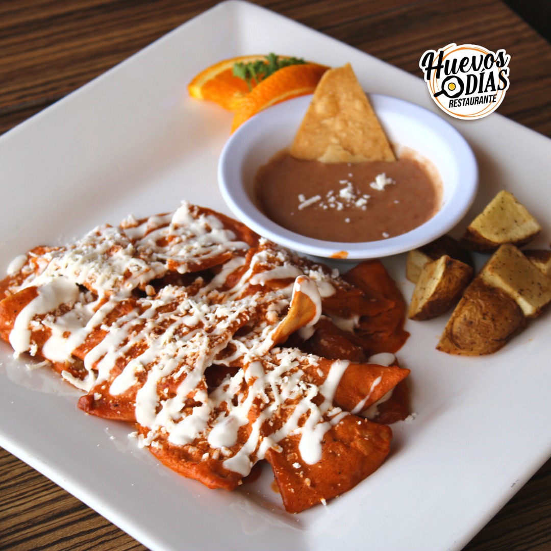 Chilaquiles con totopos de haerina de maiz(Porción personal) En salsa roja o verde acompañaros con huevo revuelto (el huevo lo escoges tu( tierno ,3/4,bien cocido, estrellados ) ) , y frijol. crema queso seco papa de la casa
