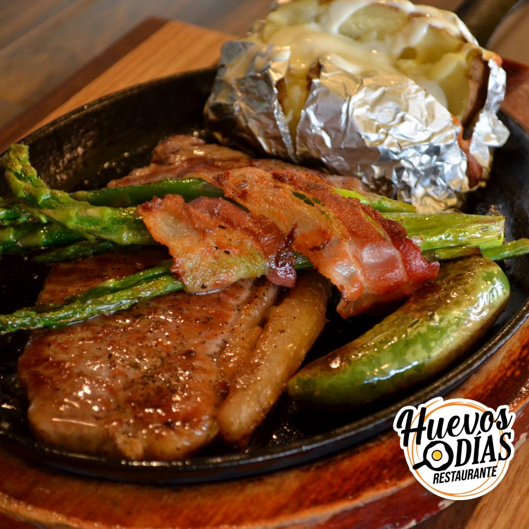 Filete New York acompañado de papa al horno y espárragos enrollados con tocino.