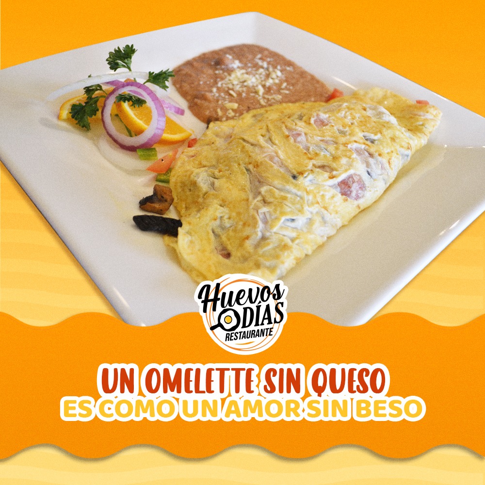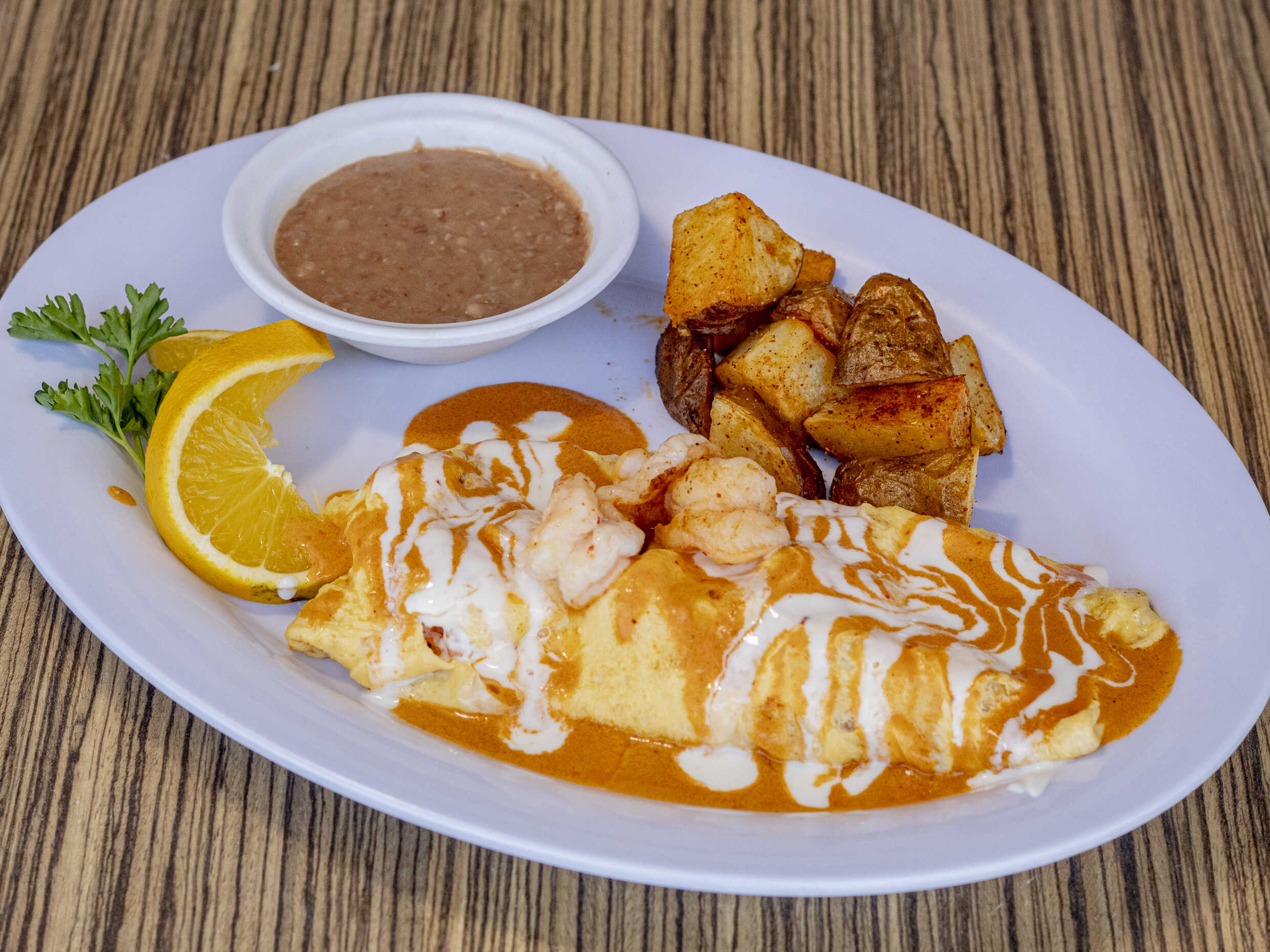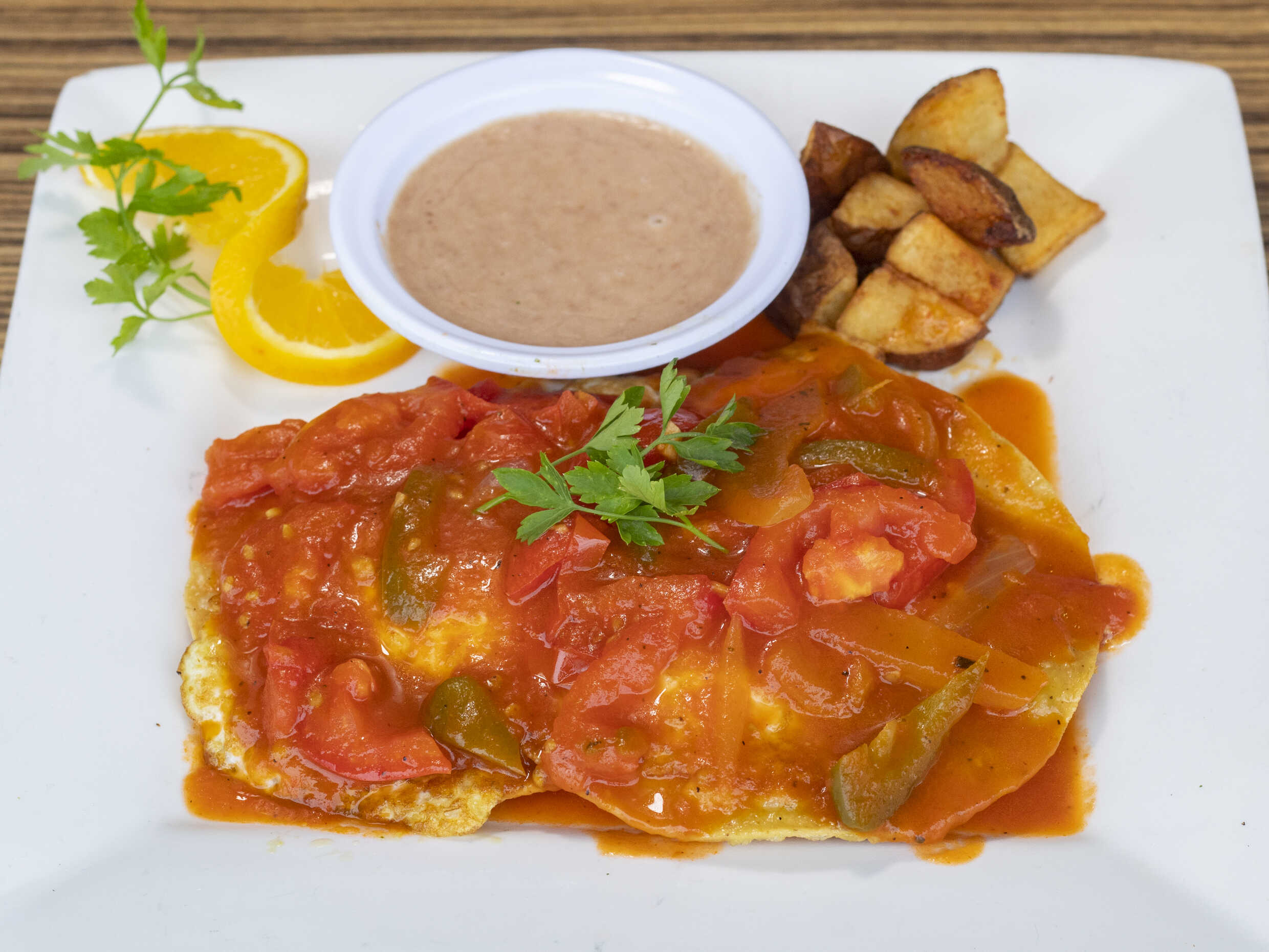 Omelette relleno de camarón y queso chihuahua bañado en salsa ranchera o chipotle, acompañado de frijol y papa de la casa.