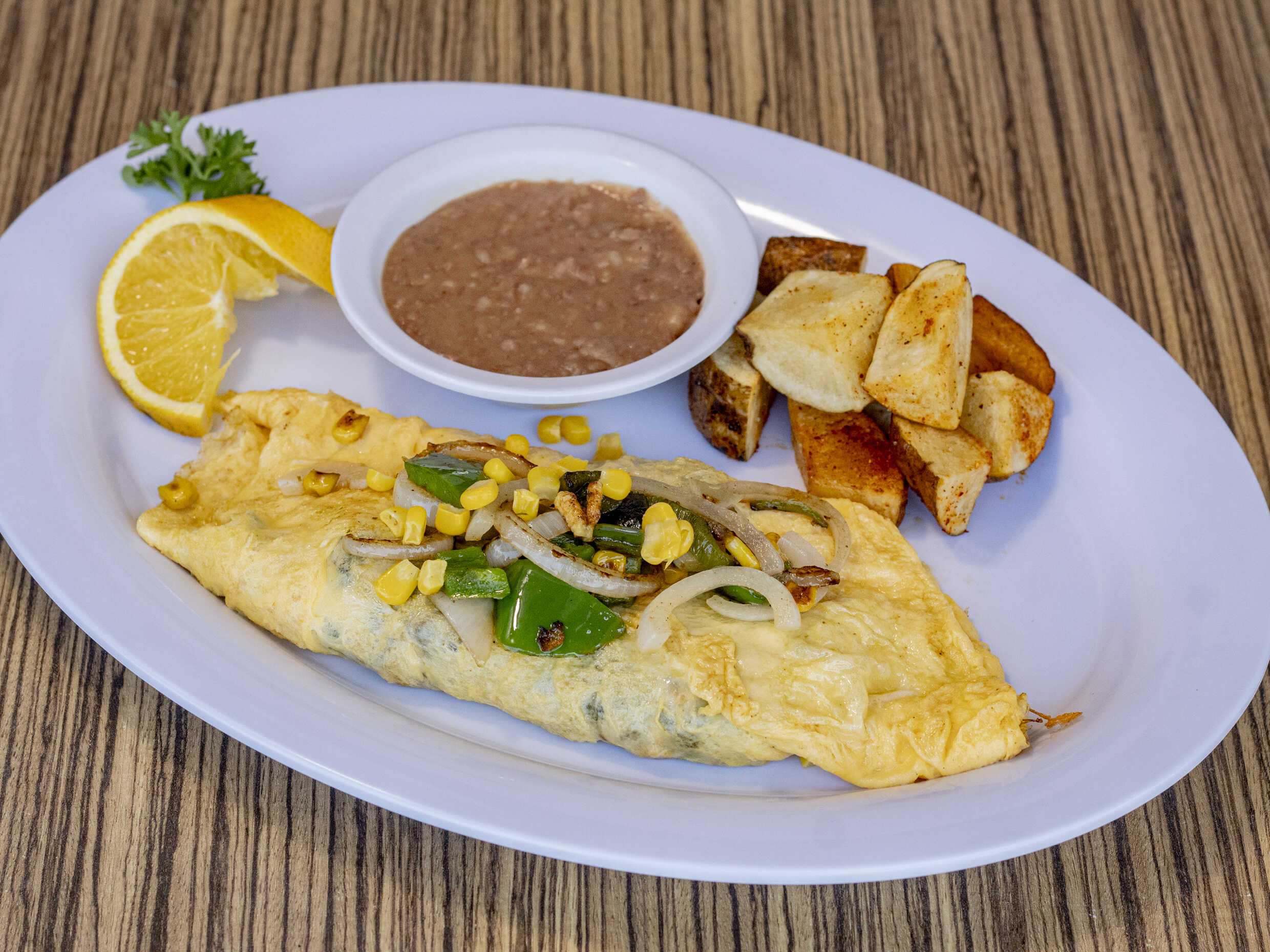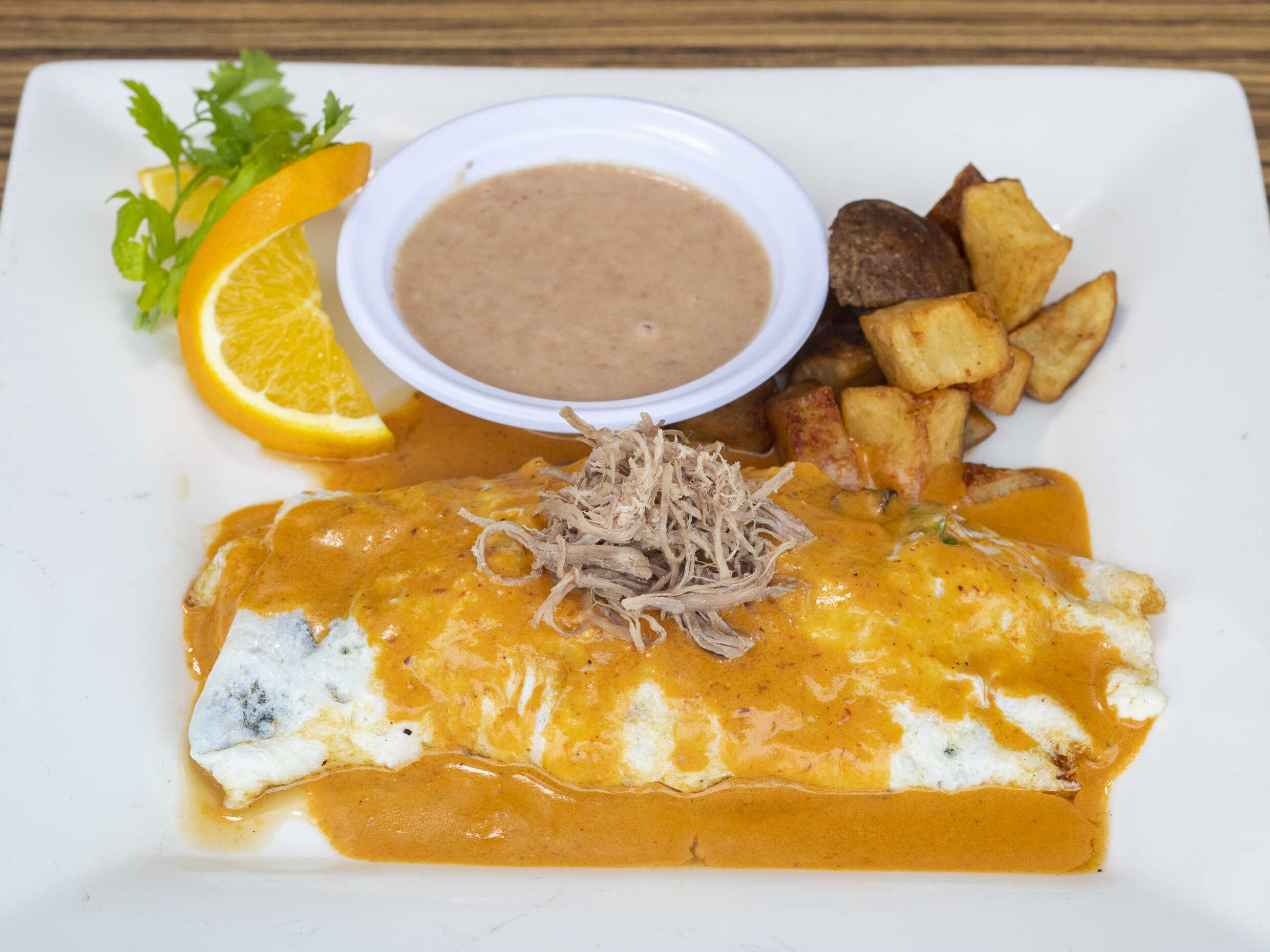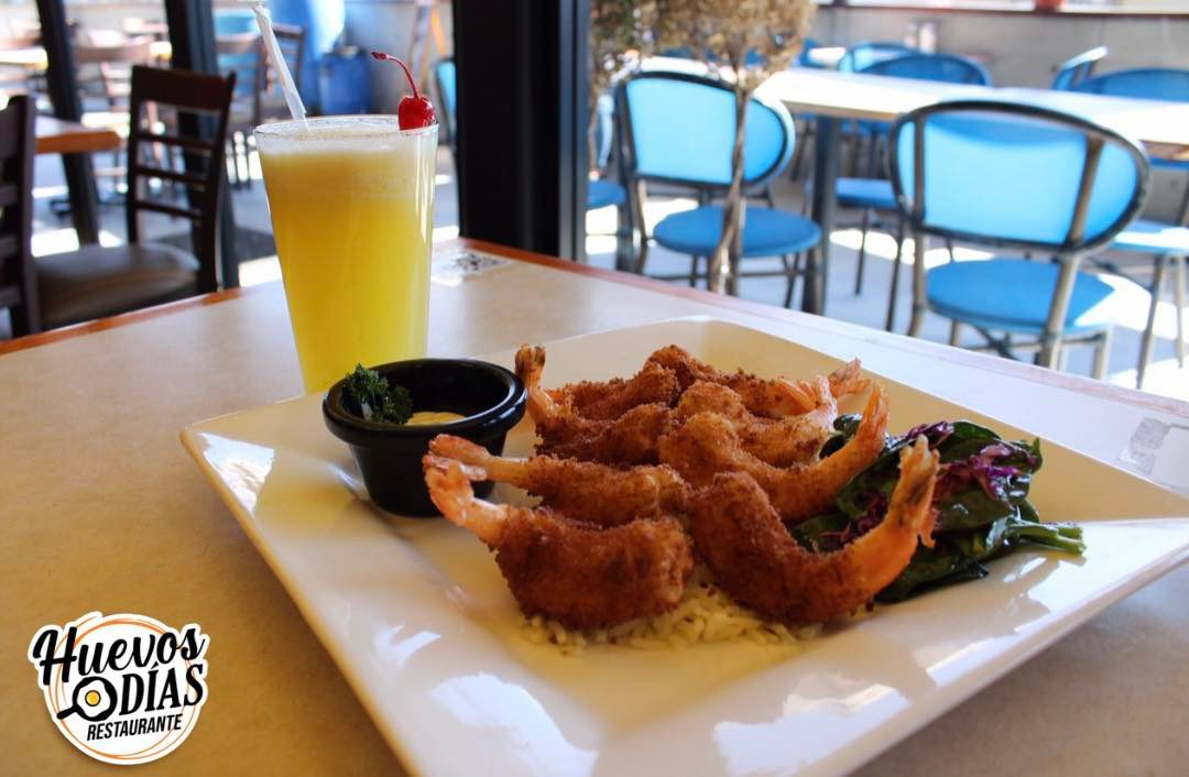 Omelette relleno de camarón y queso chihuahua bañado en salsa ranchera o chipotle, acompañado de frijol y papa de la casa.