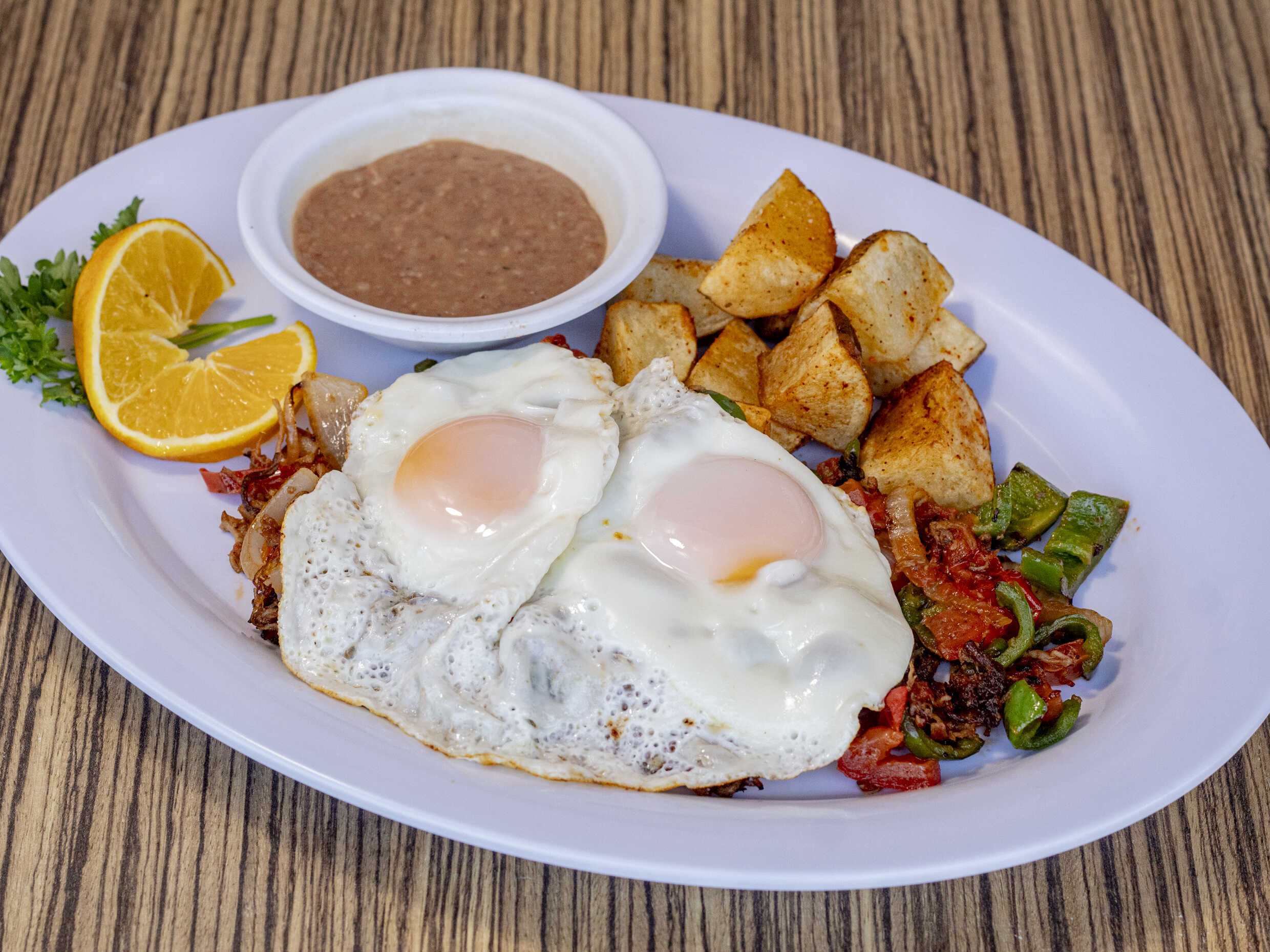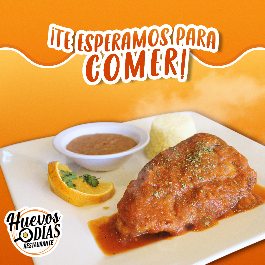 Huevos estrellados montados en un rico bistec bañado con salsa ranchera, acompañado de frijol y papa de la casa.