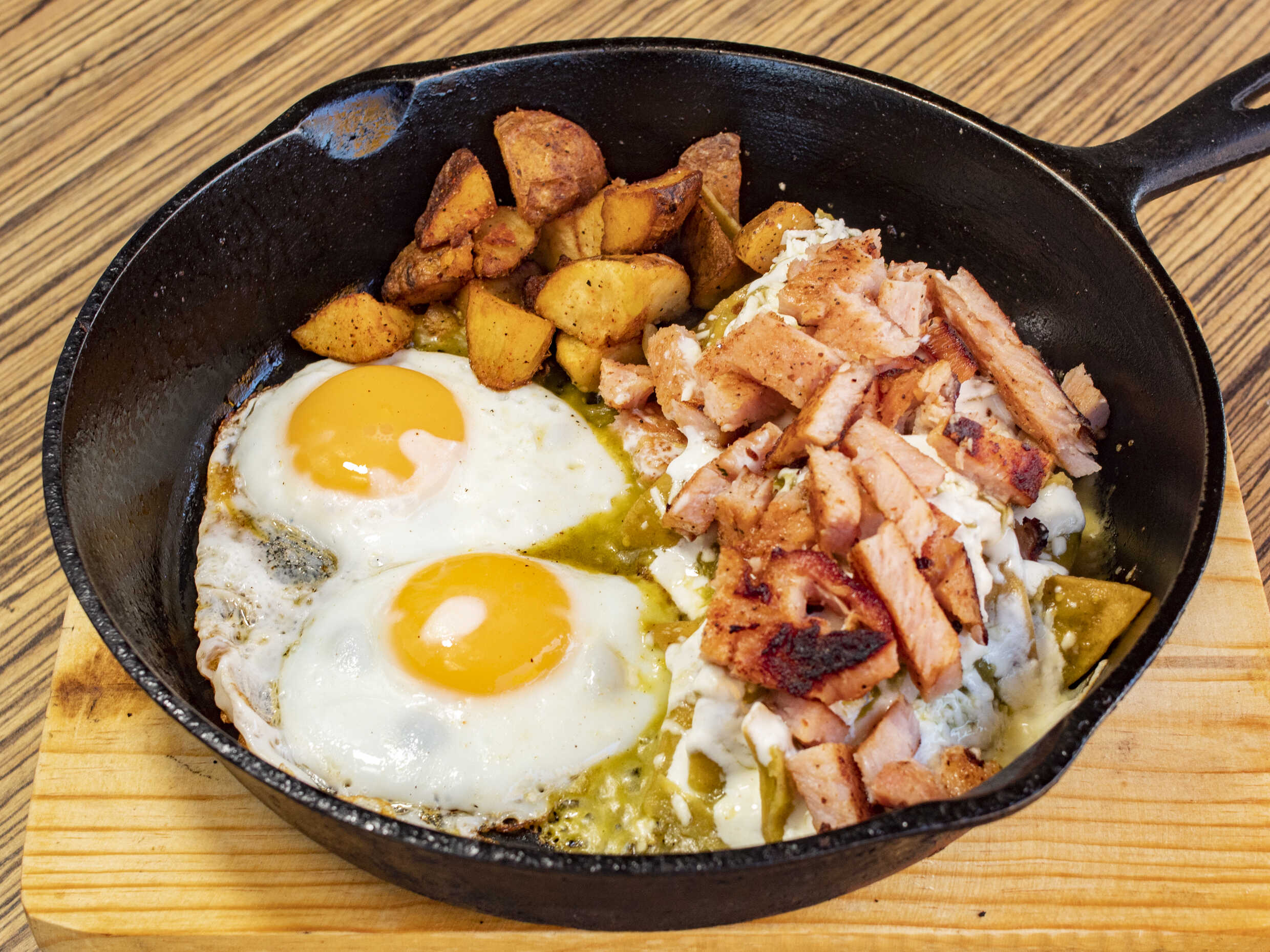 Huevos estrellados montados en chuleta ahumada, acompañados de frijol y papa de la casa.