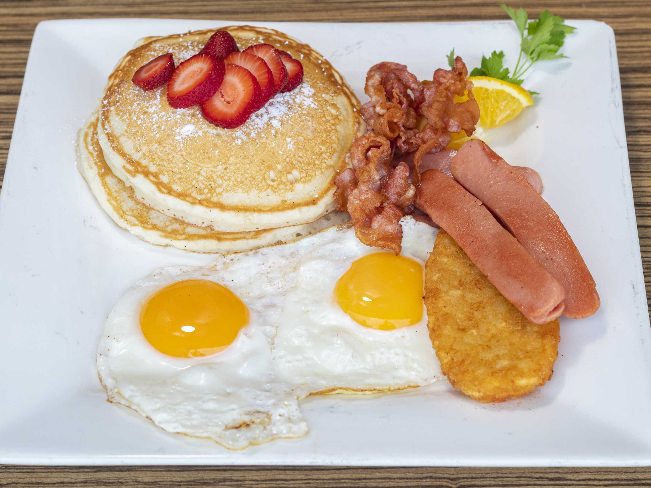 2 hot cakes a base de harina de trigo , 2 huevos (el huevo lo escoges tu( tierno ,3/4,bien cocido, estrellados ) ) y salchicha de pavo , jamón de pavo o tocino.