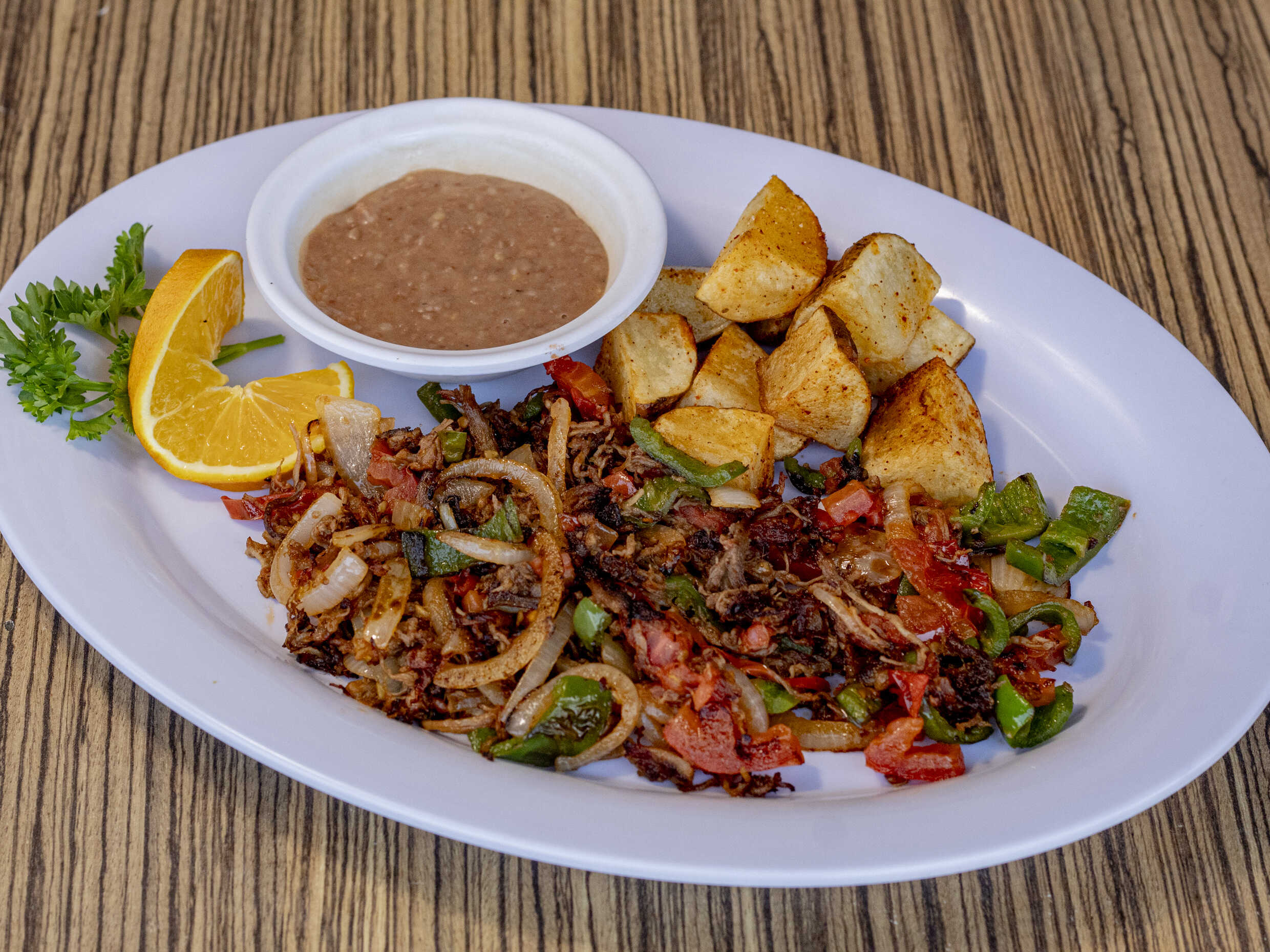 Carne deshebrada con chile, tomate y cebolla, acompañada de frijol y papa de la casa.