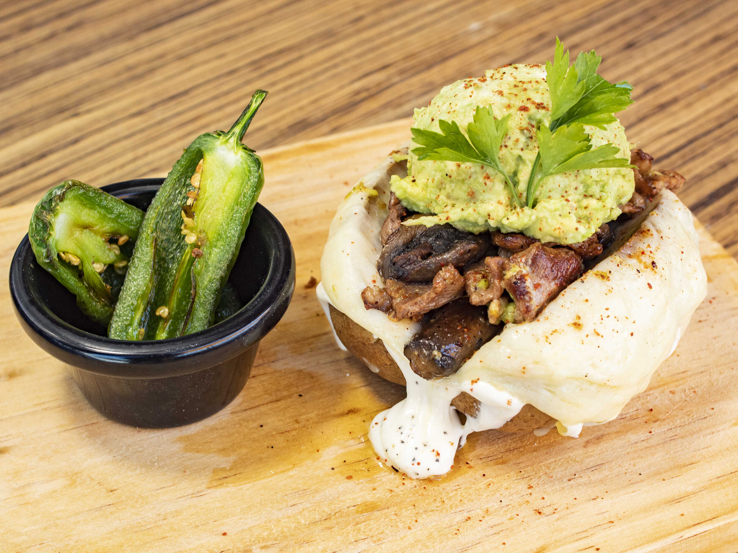 con queso gratinado, crema, cebollín y guacamole
