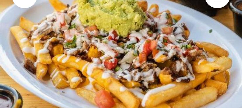 Deliciosas papas fritas con queso de nacho, carne asada, guacamole, pico de gallo y crema.