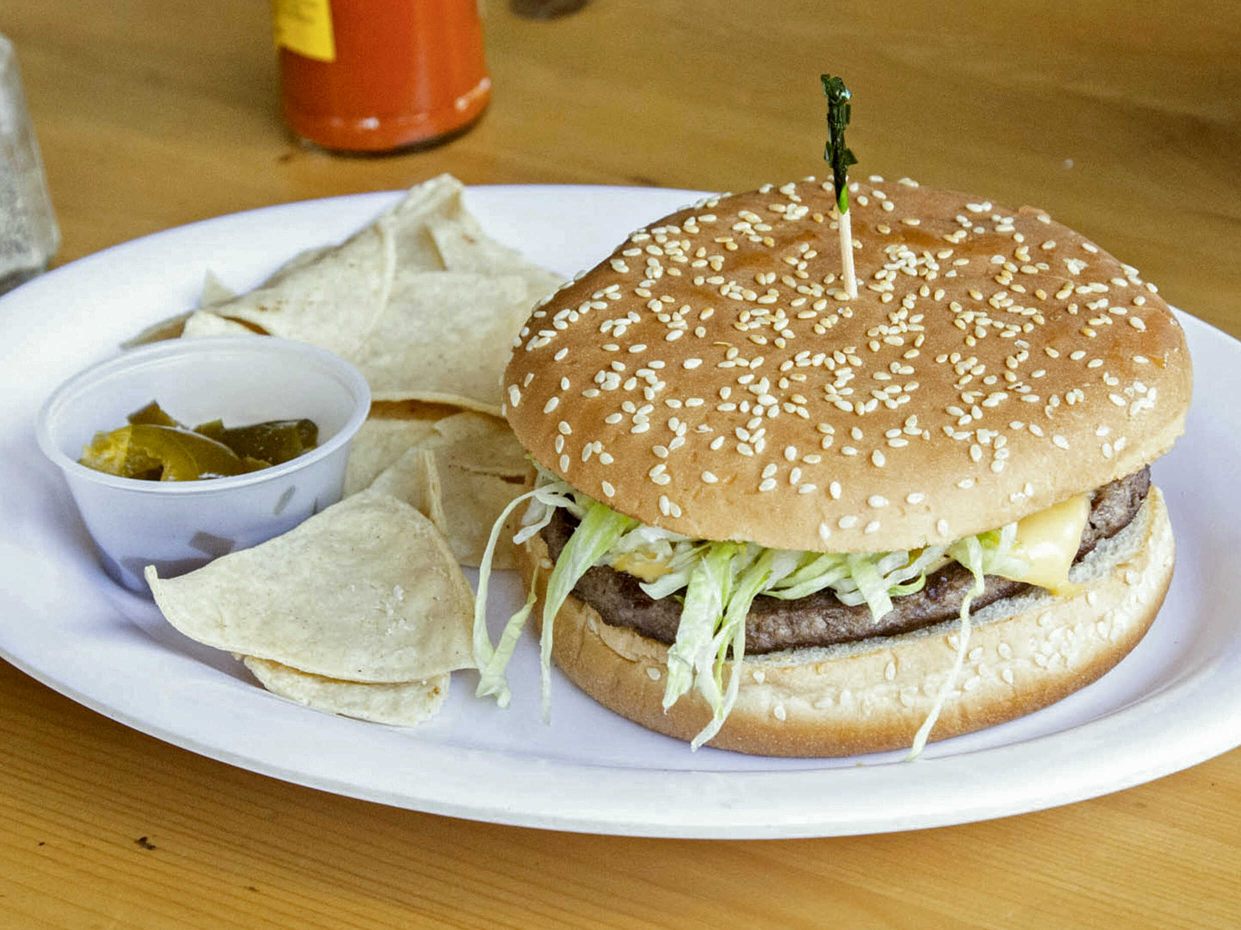 Cheeseburger con carne 100% de res, queso americano derretido, mayonesa, lechuga fresca, tomate y cebolla, servida en pan suave y dorado.
