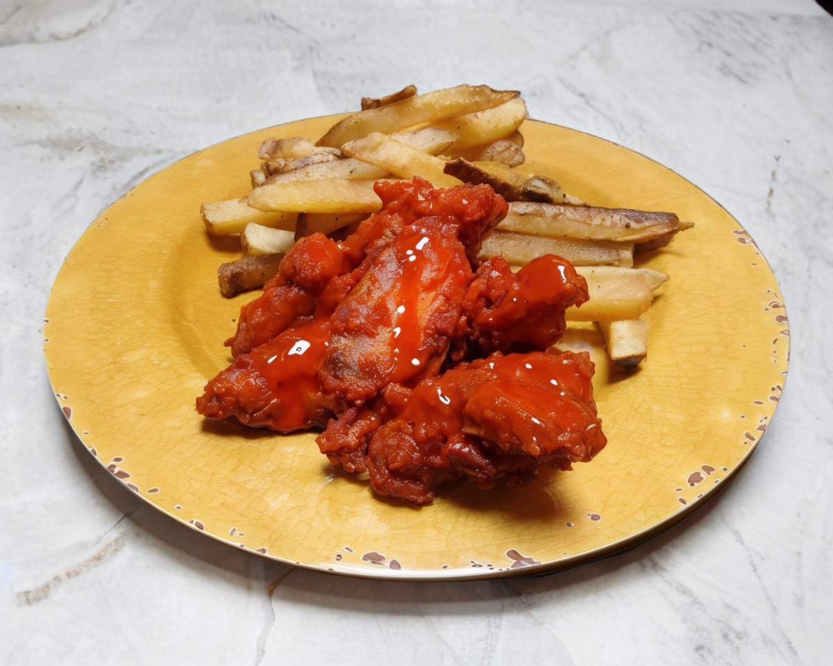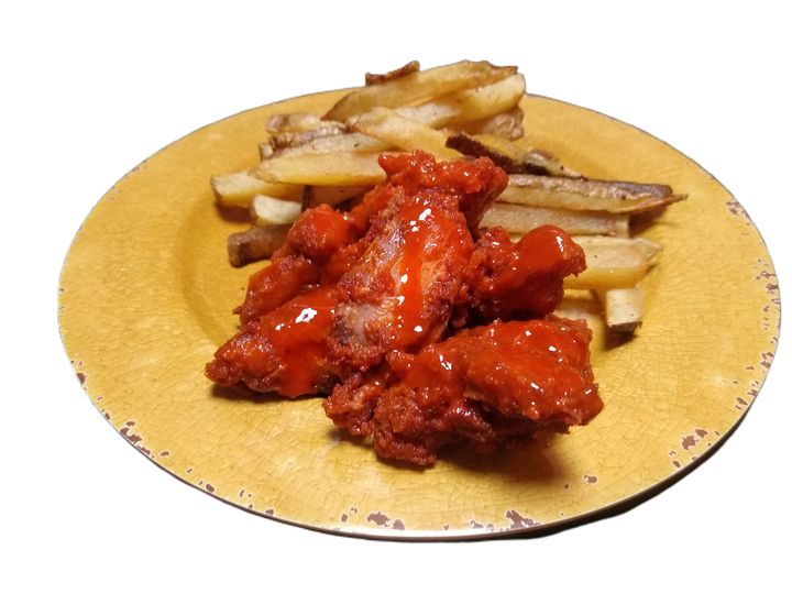 Orden de 8 alitas de pollo jugosas, bañadas en salsa búfalo o BBQ, para elegir según tu gusto.