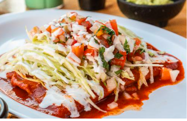 Tres enchiladas rellenas de queso monterrey, bañadas en salsa roja o verde, coronadas con lechuga fresca, pico de gallo y un toque de crema, un platillo tradicional lleno de sabor.