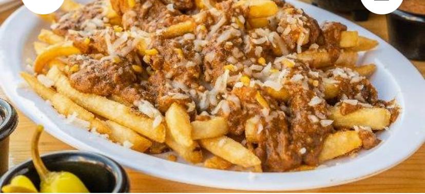Papas fritas, chili hecho en casa y queso rallado derretido.