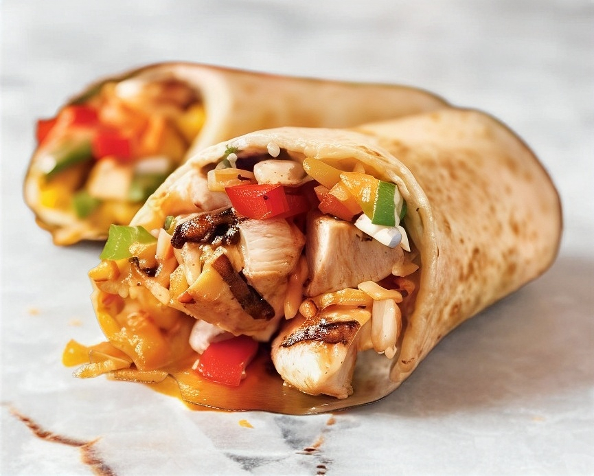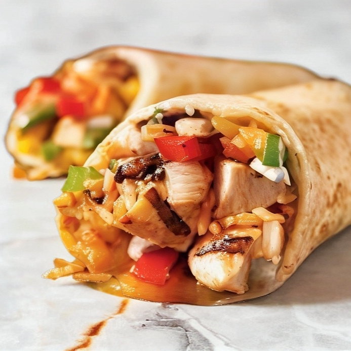 Burrito relleno de jugosa pechuga de pollo, frijoles, arroz, cilantro fresco y cebolla picada, todo envuelto en una tortilla de harina suave.