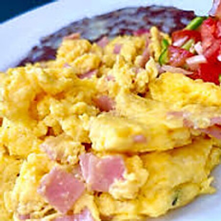 Un delicioso platillo con dos huevos revueltos con jamón, cocinados hasta quedar jugosos y llenos de sabor, acompañados de papa dorada y crujiente, frijoles bien sazonados y unos chilaquiles bañados en salsa roja o verde, creando una combinación perfecta de sabores auténticos.