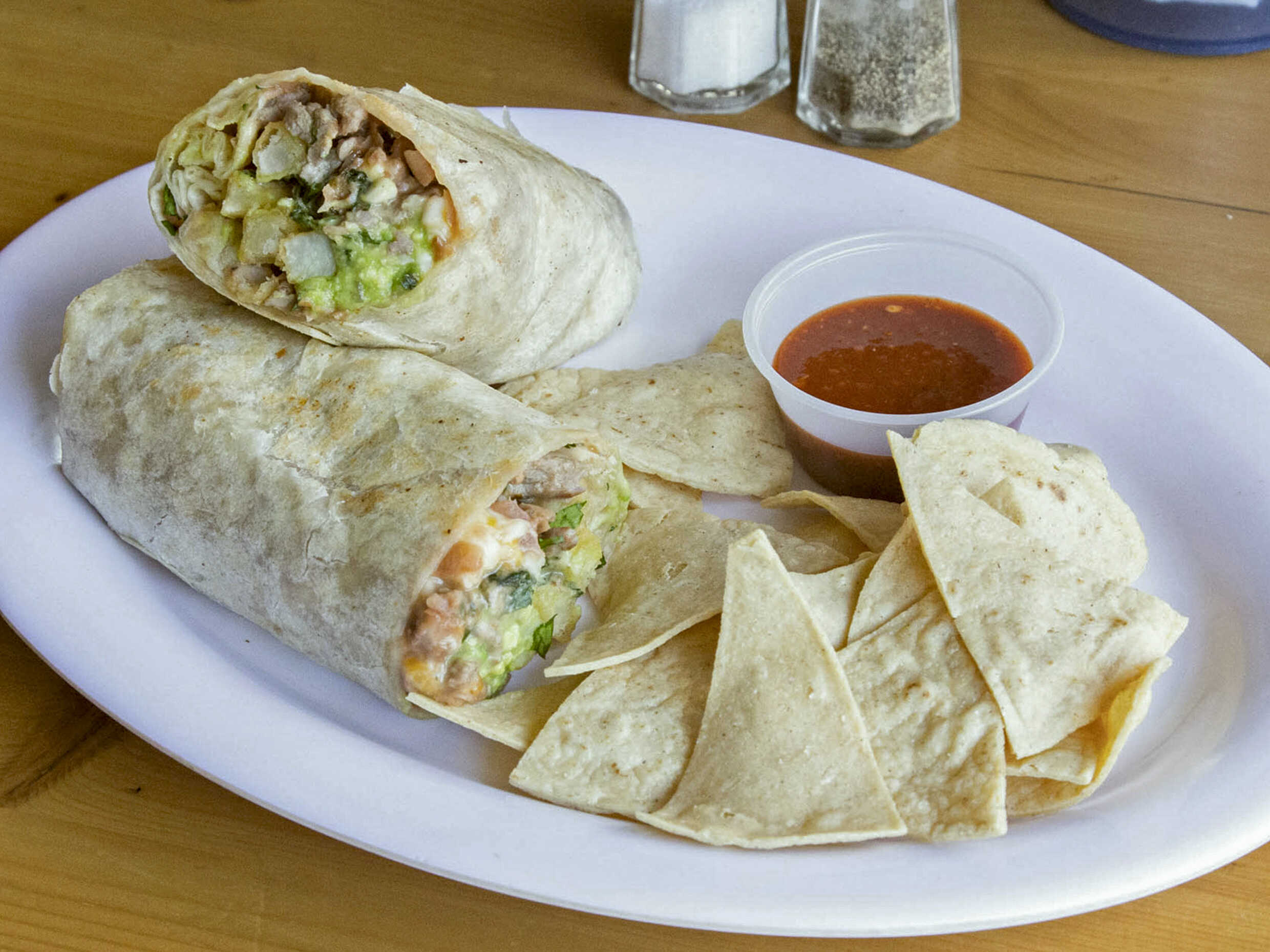 Burrito relleno de espinacas frescas, champiñones salteados, arroz esponjoso, frijoles refritos, tomate, cebolla, chile morrón y guacamole casero, todo envuelto en una tortilla de harina suave.