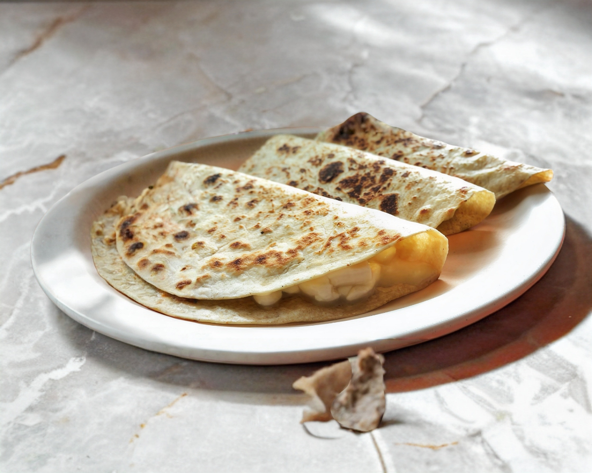 Quesadilla grande rellena de jugosa carne, servida en 4 piezas, acompañada de guacamole fresco, pequeña ensalada y crema.