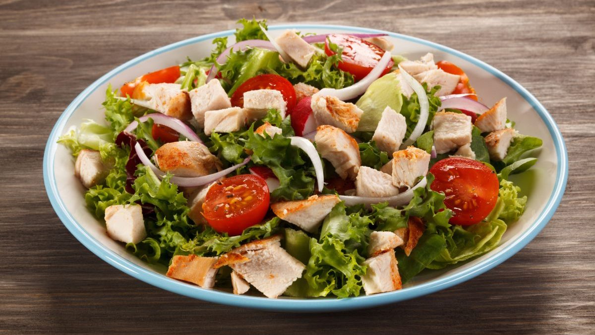 Colorida ensalada de lechuga fresca con tomate, pepino, zanahoria rallada y queso, servida con pechuga de pollo a la plancha y aguacate en la parte superior.