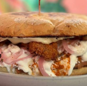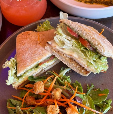 Pollo pesto: pesto de la casa, pan ciabatta, tomate, lechuga y queso suizo, acompañado de papas.