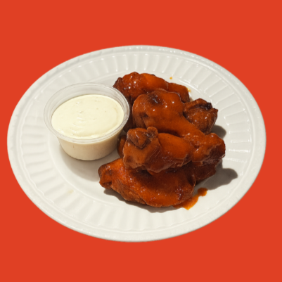 Alitas doradas, acompañadas de un aderezo ranch casero y salsa de preferencia.