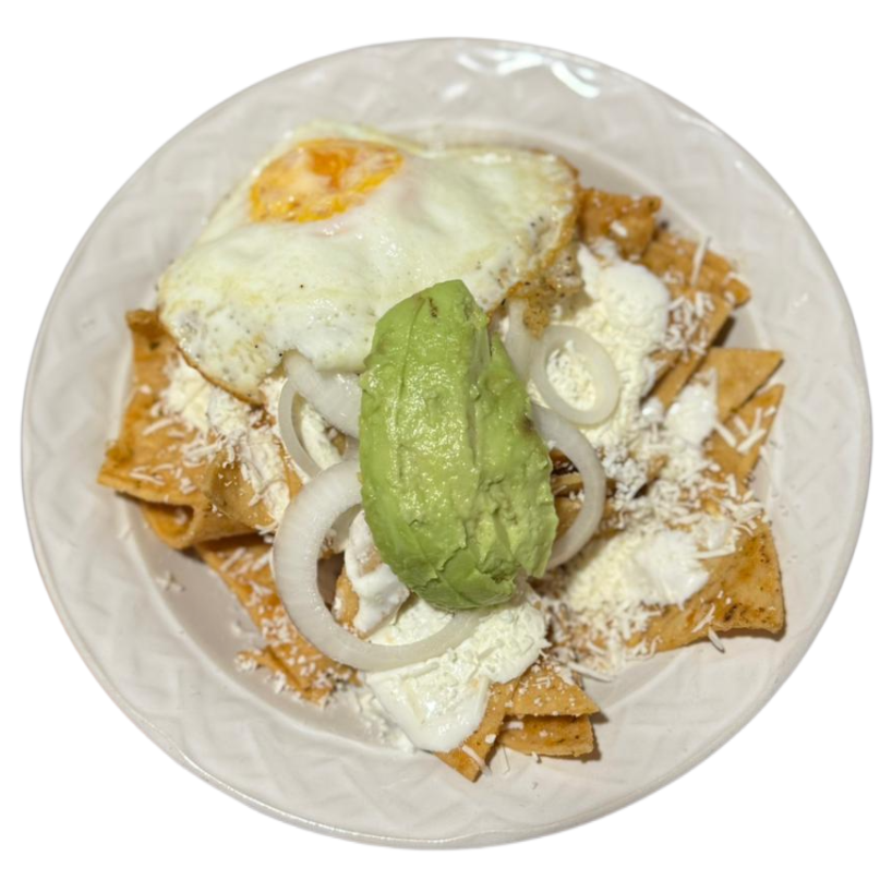Totopo dorado, bañado en salsa verde o roja. Lleva crema y queso, y cremoso de aguacate, va coronando con cebolla y aguacate fresco.