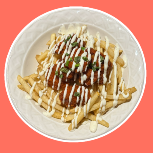 Una cama de papas francesas (200 G) con una porción de boneless (170G) en la parte de encima, decorado con ranch casero en forma de hilo y cebollín.