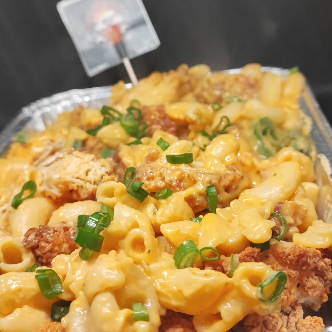 Hecho con 3 Crujientes Pollo Tenders y una cama de Macaroni con queso!