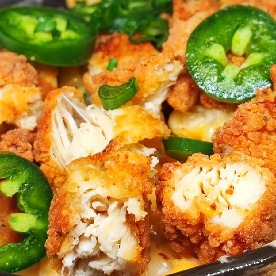 Crujientes pollo tenders en una cama de Macaroni & queso ahumado.