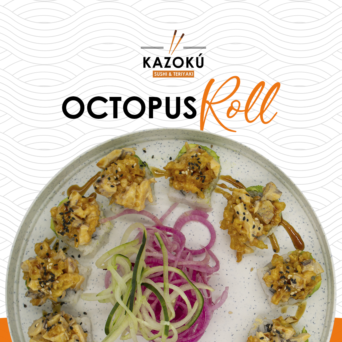 Camarón crunchy, queso creme, pepino, forrado de aguacate, pulpo con hojuelas de tempura spicy y ajonjolí.