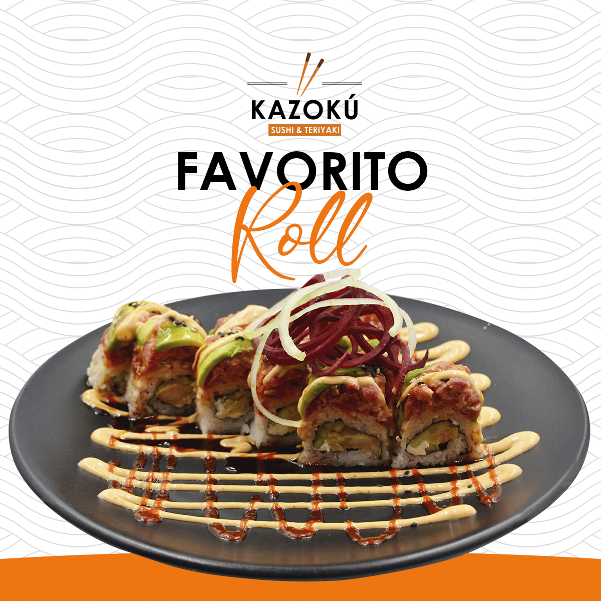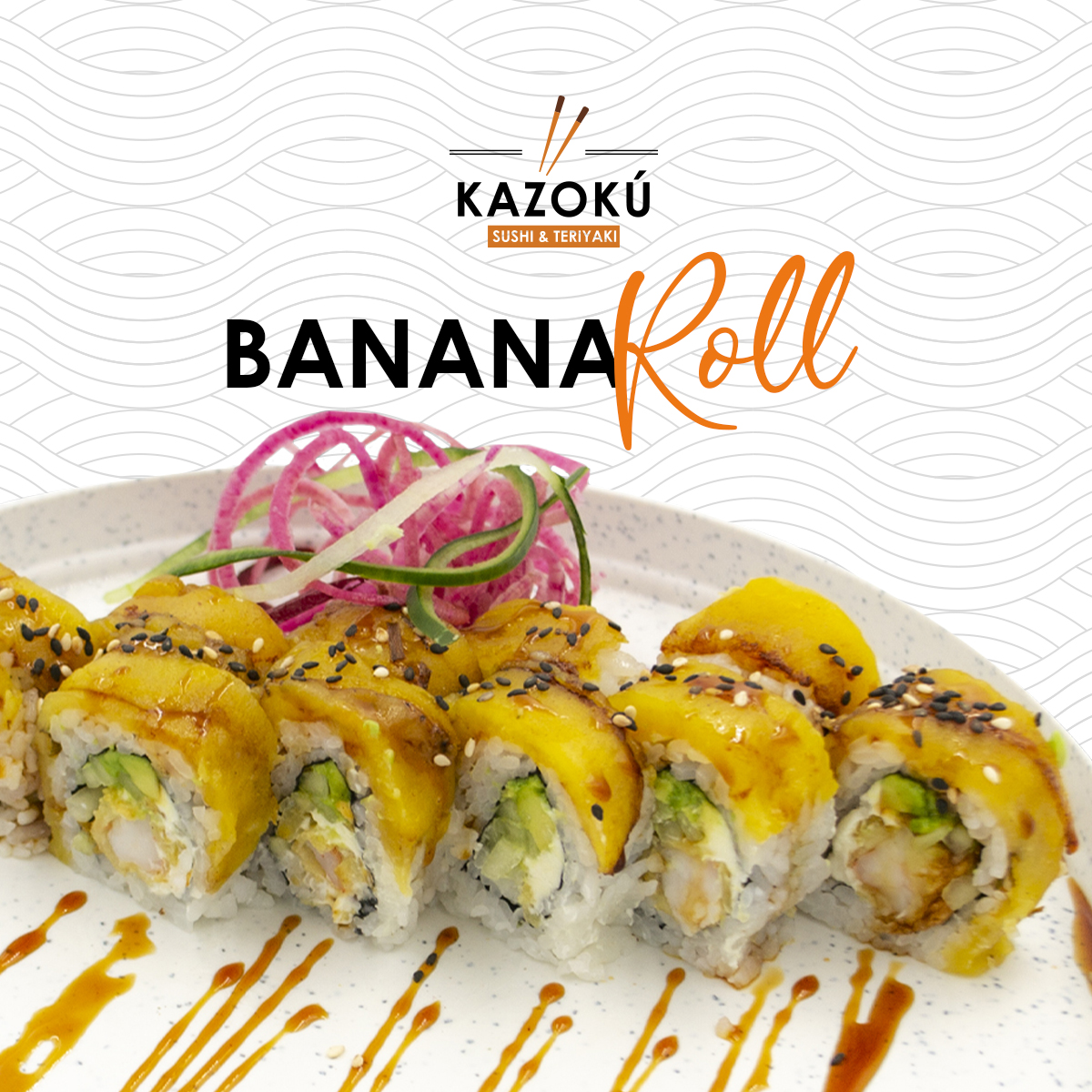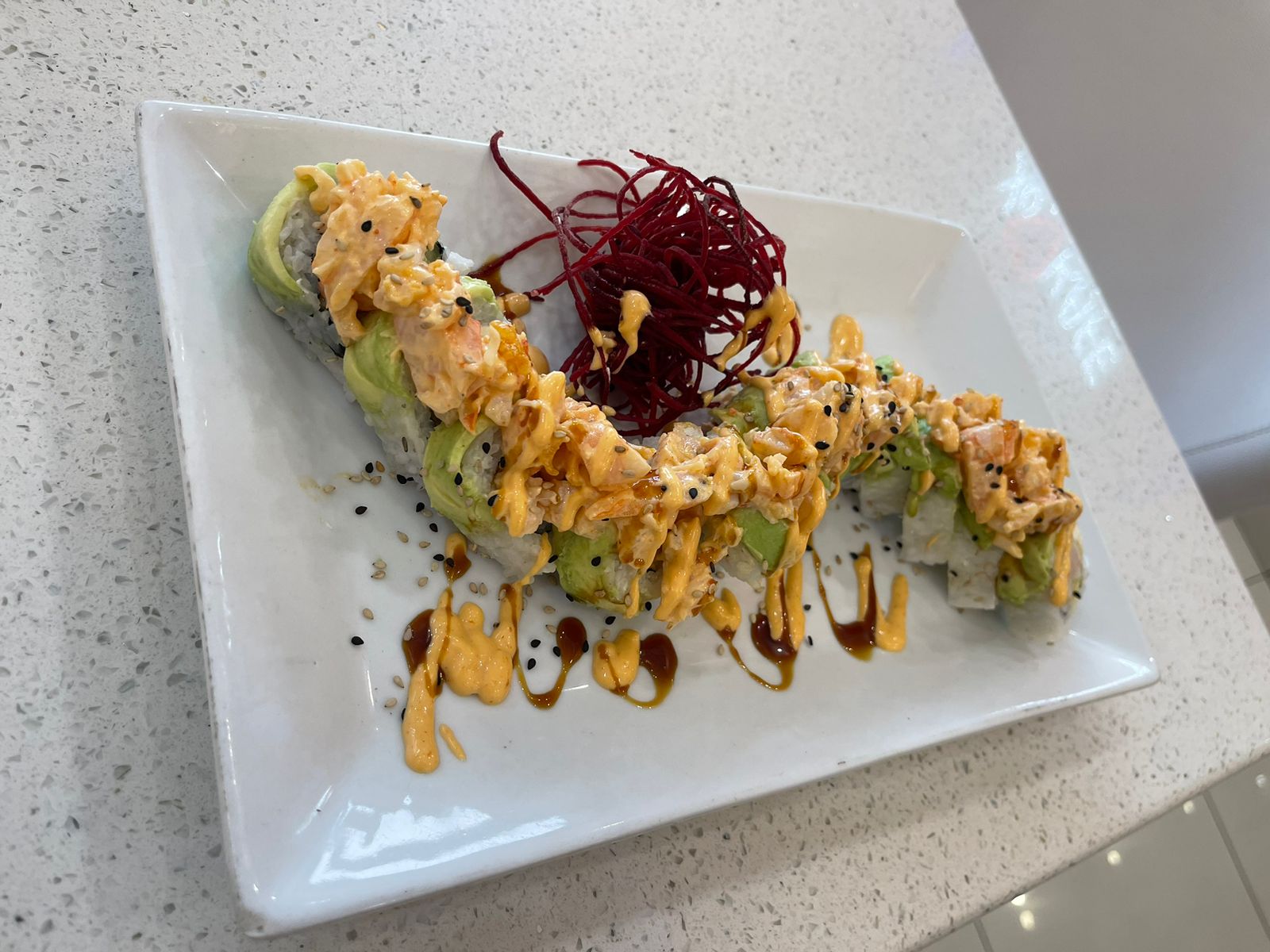 Camarón tempura, atún, queso, pepino, forrado de cangrejo spicy, salmón y camarón, forrado de aguacate y bañado en salsa dulce.
