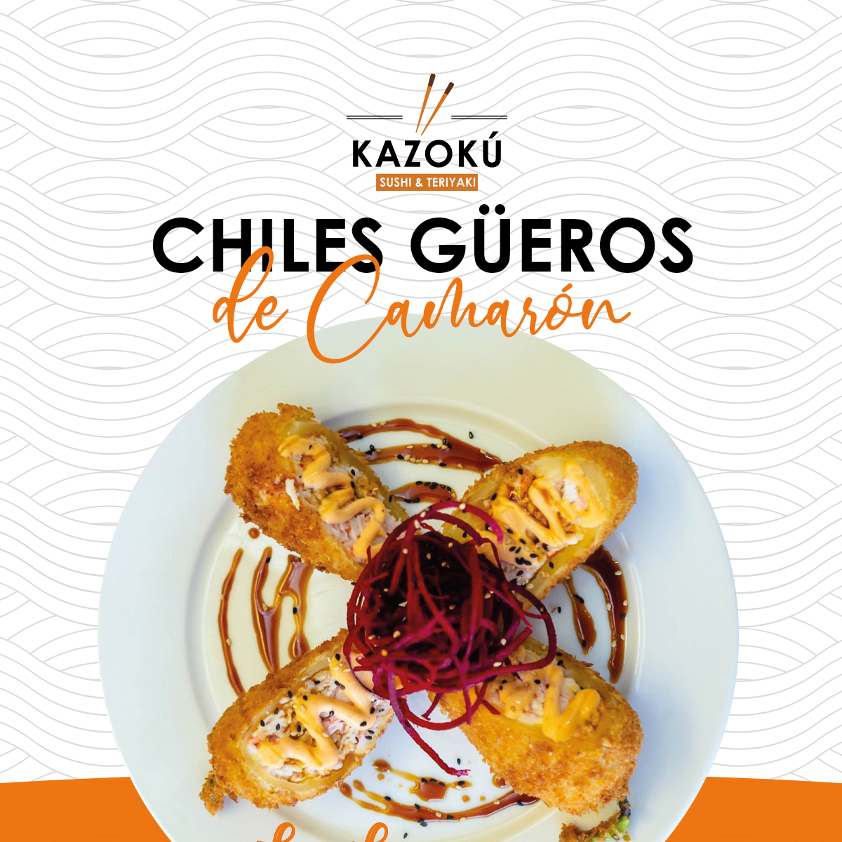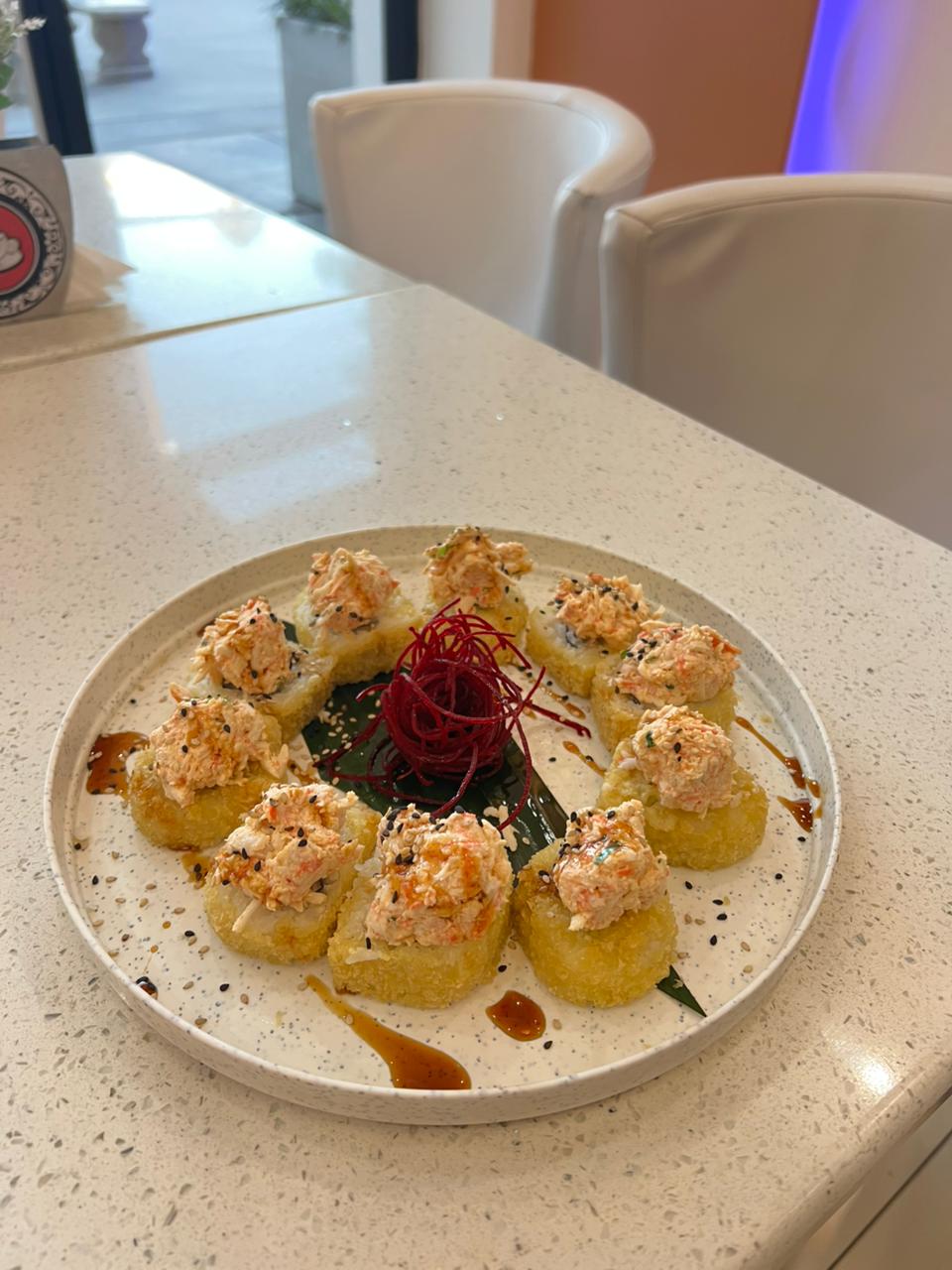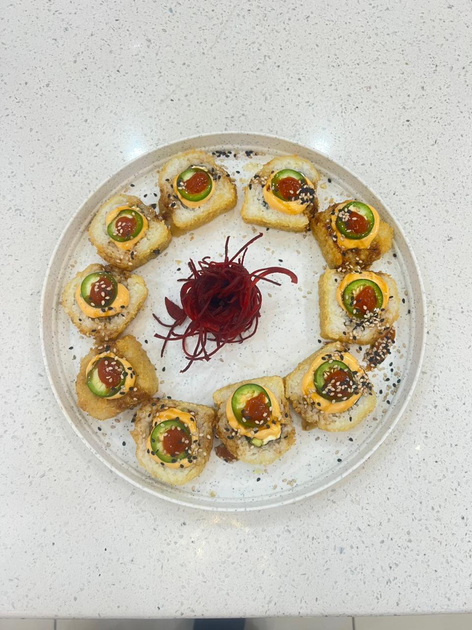 Relleno de surimi, queso crema y aguacate empanizado, con topping de salsa spicy rodajas de chile serrano , un toque de siracha y bañado en salsa de anguila