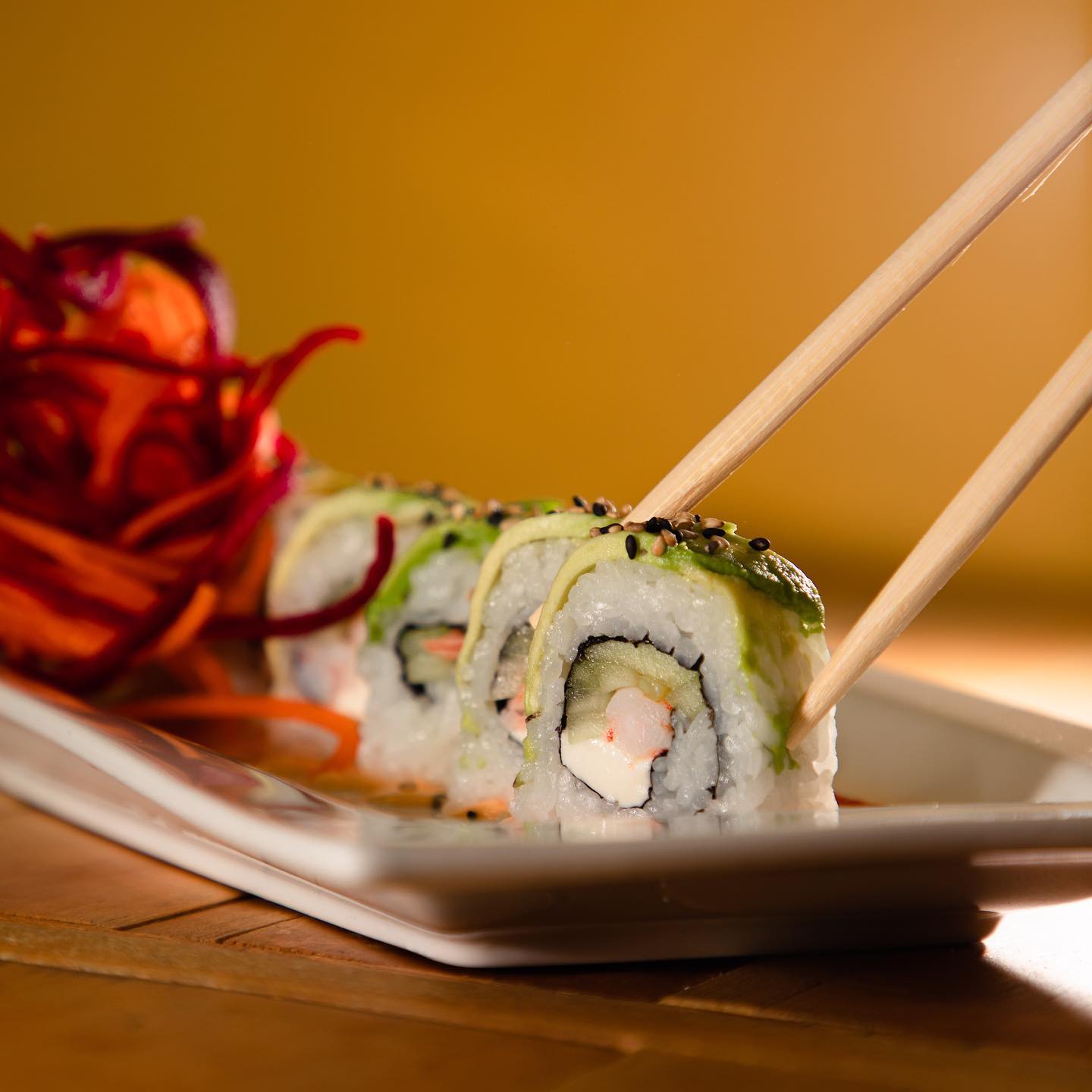 Camarón cocido, pepino, queso crema, forrado de aguacate rebanado en salsa dulce y ajonjolí.